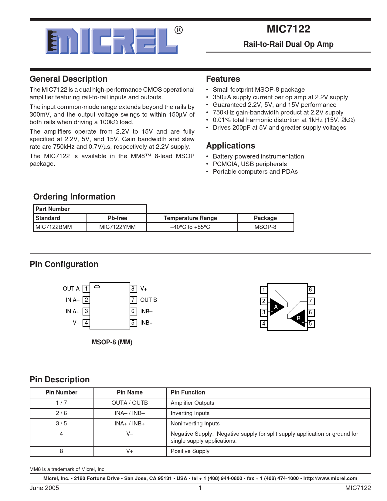 MIC7122. Rail-to-Rail Dual Op Amp. General Description. Features. Applications. Ordering Information. Part Number. Standard. Pb-free