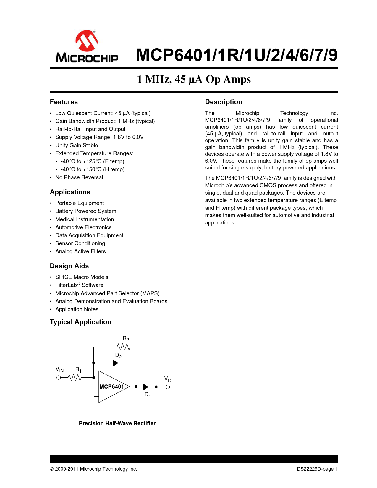 MCP6401/1R/1U/2/4/6/7/9. 1 MHz, 45 µA Op Amps. Features. Description. Applications. Design Aids. Typical Application. MCP6401