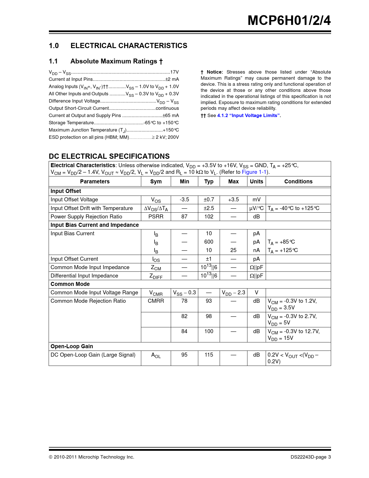MCP6H01/2/4 1.0 ELECTRICAL CHARACTERISTICS 1.1 Absolute Maximum Ratings † † Notice: 4.1.2 “Input Voltage Limits”