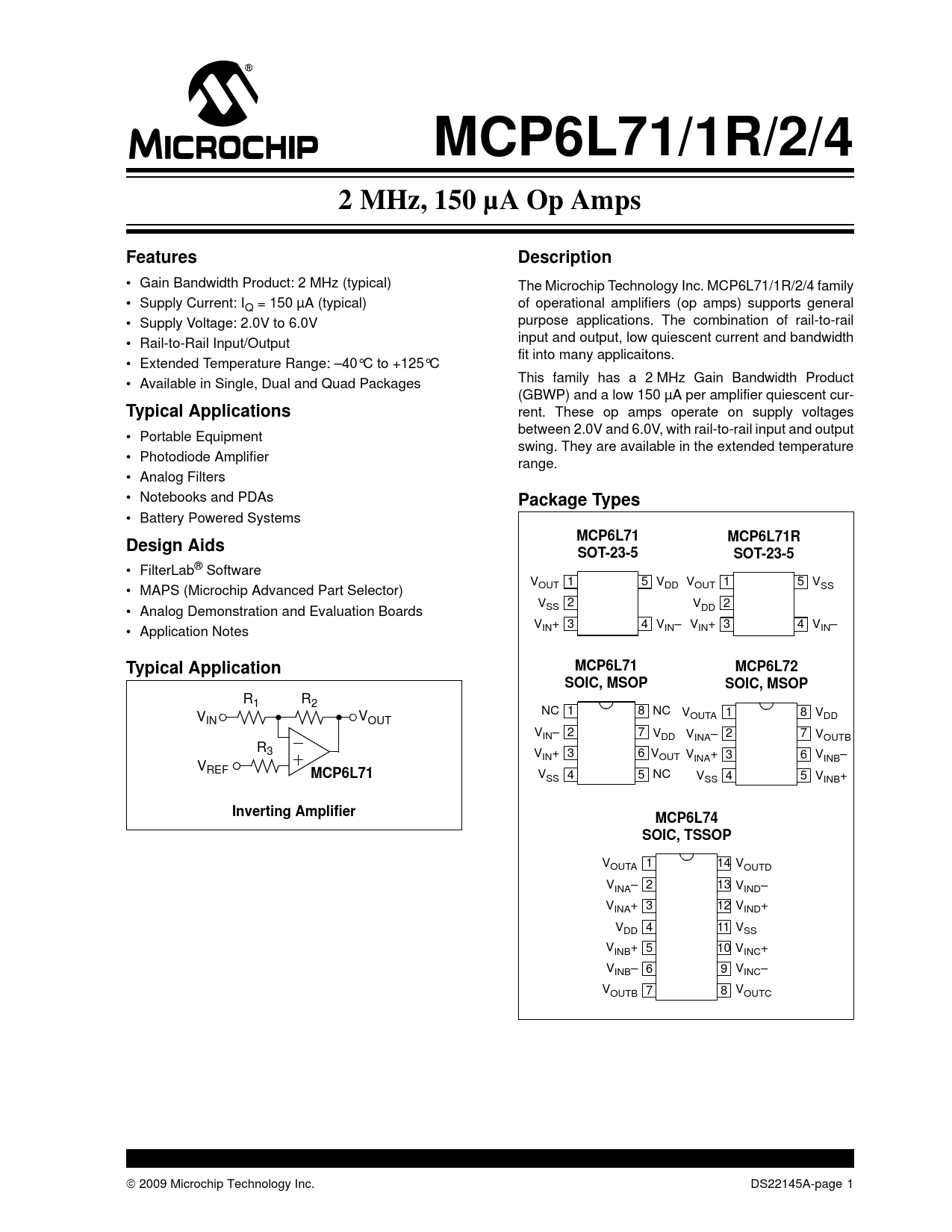 MCP6L71/1R/2/4. 2 MHz, 150 µA Op Amps. Features. Description. Typical Applications. Package Types. MCP6L71. MCP6L71R. Design Aids