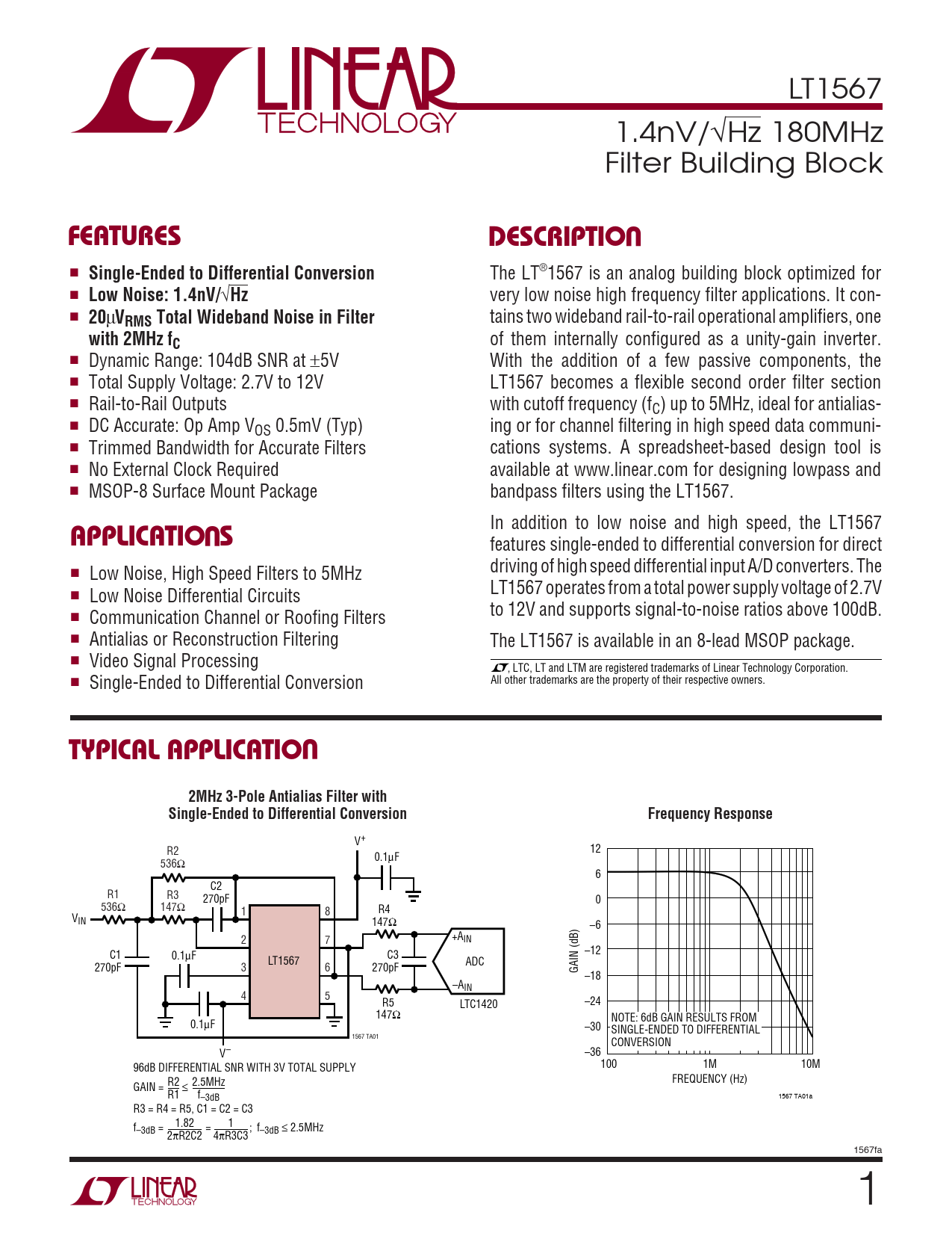 features single-ended to differential conversion for direct driving of high speed differential input A/D converters. The ■ Low Noise, High Speed Filters to 5MHz LT1567 operates from a total power supply voltage of 2.7V ■ Low Noise Differential Circuits to 12V and supports signal-to-noise ratios above 100dB. ■ Communication Channel or Roofing Filters ■ Antialias or Reconstruction Filtering The LT1567 is available in an 8-lead MSOP package. ■ Video Signal Processing , LTC, LT and LTM are registered trademarks of Linear Technology Corporation. All other trademarks are the property of their respective owners. ■ Single-Ended to Differential Conversion