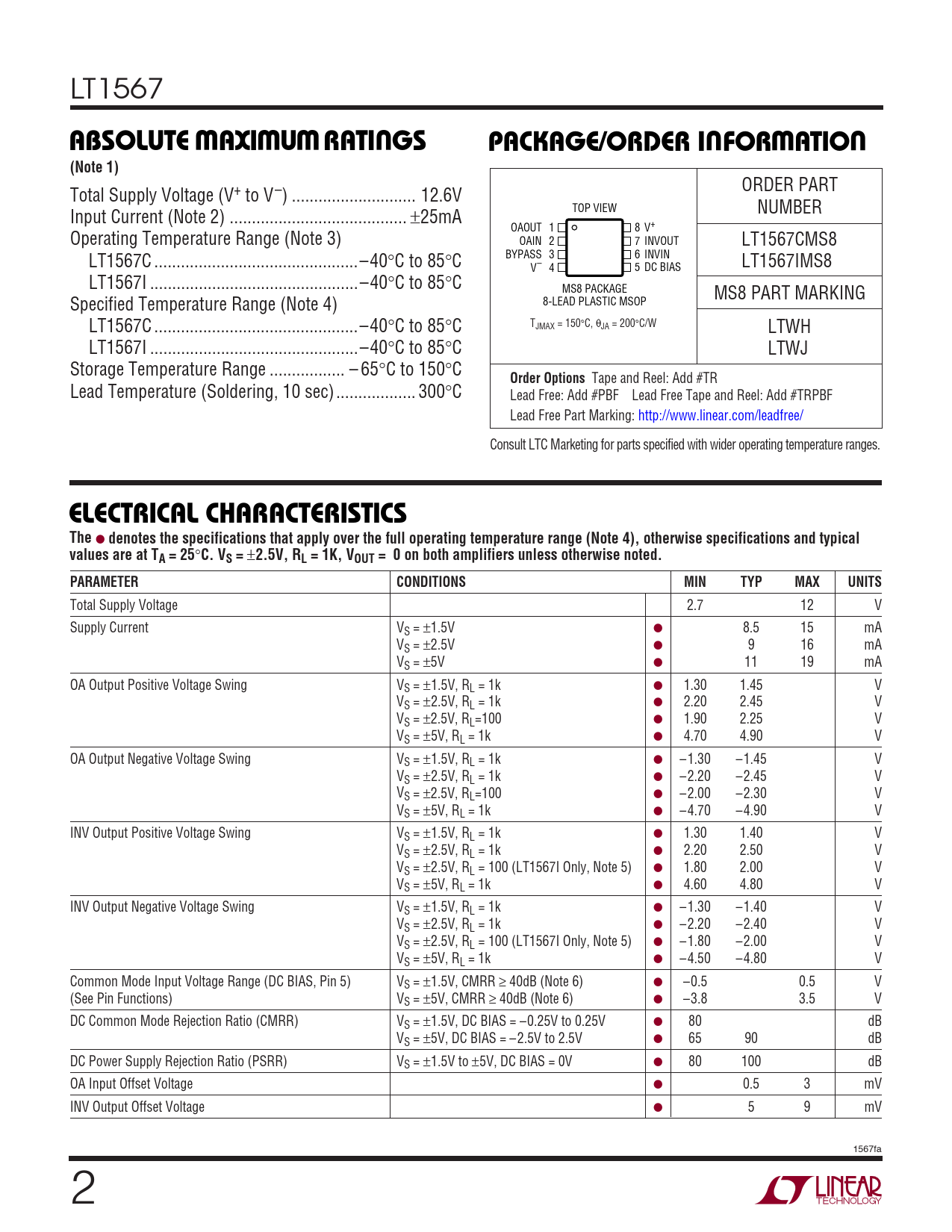 Total Supply Voltage 2.7 12 V Supply Current VS = ±1.5V ● 8.5 15 mA VS = ±2.5V ● 9 16 mA VS = ±5V ● 11 19 mA OA Output Positive Voltage Swing VS = ±1.5V, RL = 1k ● 1.30 1.45 V VS = ±2.5V, RL = 1k ● 2.20 2.45 V VS = ±2.5V, RL=100 ● 1.90 2.25 V VS = ±5V, RL = 1k ● 4.70 4.90 V OA Output Negative Voltage Swing VS = ±1.5V, RL = 1k ● –1.30 –1.45 V VS = ±2.5V, RL = 1k ● –2.20 –2.45 V VS = ±2.5V, RL=100 ● –2.00 –2.30 V VS = ±5V, RL = 1k ● –4.70 –4.90 V INV Output Positive Voltage Swing VS = ±1.5V, RL = 1k ● 1.30 1.40 V VS = ±2.5V, RL = 1k ● 2.20 2.50 V VS = ±2.5V, RL = 100 (LT1567I Only, Note 5) ● 1.80 2.00 V VS = ±5V, RL = 1k ● 4.60 4.80 V INV Output Negative Voltage Swing VS = ±1.5V, RL = 1k ● –1.30 –1.40 V VS = ±2.5V, RL = 1k ● –2.20 –2.40 V VS = ±2.5V, RL = 100 (LT1567I Only, Note 5) ● –1.80 –2.00 V VS = ±5V, RL = 1k ● –4.50 –4.80 V Common Mode Input Voltage Range (DC BIAS, Pin 5) VS = ±1.5V, CMRR ≥ 40dB (Note 6) ● –0.5 0.5 V (See Pin Functions) VS = ±5V, CMRR ≥ 40dB (Note 6) ● –3.8 3.5 V DC Common Mode Rejection Ratio (CMRR) VS = ±1.5V, DC BIAS = –0.25V to 0.25V ● 80 dB VS = ±5V, DC BIAS = –2.5V to 2.5V ● 65 90 dB DC Power Supply Rejection Ratio (PSRR) VS = ±1.5V to ±5V, DC BIAS = 0V ● 80 100 dB OA Input Offset Voltage ● 0.5 3 mV INV Output Offset Voltage ● 5 9 mV 1567fa 2