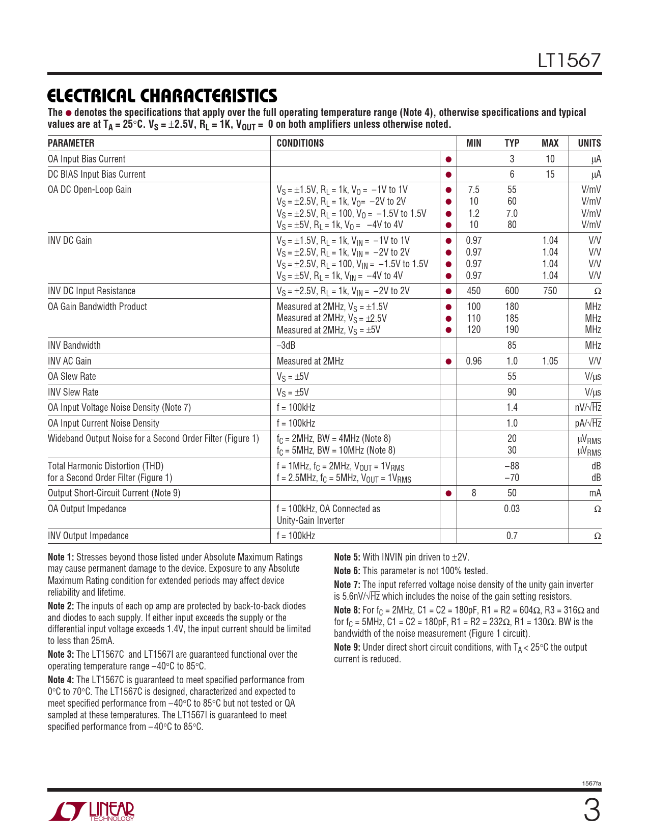 LT1567 ELECTRICAL CHARACTERISTICSThe ● denotes the specifications that apply over the full operating temperature range (Note 4), otherwise specifications and typical values are at TA = 25 ° C. VS = ± 2.5V, RL = 1K, VOUT = 0 on both amplifiers unless otherwise noted.PARAMETERCONDITIONSMINTYPMAXUNITS OA Input Bias Current ● 3 10 µA DC BIAS Input Bias Current ● 6 15 µA OA DC Open-Loop Gain VS = ±1.5V, RL = 1k, VO = –1V to 1V ● 7.5 55 V/mV VS = ±2.5V, RL = 1k, VO= –2V to 2V ● 10 60 V/mV VS = ±2.5V, RL = 100, VO = –1.5V to 1.5V ● 1.2 7.0 V/mV VS = ±5V, RL = 1k, VO = –4V to 4V ● 10 80 V/mV INV DC Gain VS = ±1.5V, RL = 1k, VIN = –1V to 1V ● 0.97 1.04 V/V VS = ±2.5V, RL = 1k, VIN = –2V to 2V ● 0.97 1.04 V/V VS = ±2.5V, RL = 100, VIN = –1.5V to 1.5V ● 0.97 1.04 V/V VS = ±5V, RL = 1k, VIN = –4V to 4V ● 0.97 1.04 V/V INV DC Input Resistance VS = ±2.5V, RL = 1k, VIN = –2V to 2V ● 450 600 750 Ω OA Gain Bandwidth Product Measured at 2MHz, VS = ±1.5V ● 100 180 MHz Measured at 2MHz, VS = ±2.5V ● 110 185 MHz Measured at 2MHz, VS = ±5V ● 120 190 MHz INV Bandwidth –3dB 85 MHz INV AC Gain Measured at 2MHz ● 0.96 1.0 1.05 V/V OA Slew Rate VS = ±5V 55 V/µs INV Slew Rate VS = ±5V 90 V/µs OA Input Voltage Noise Density (Note 7) f = 100kHz 1.4 nV/√Hz OA Input Current Noise Density f = 100kHz 1.0 pA/√Hz Wideband Output Noise for a Second Order Filter (Figure 1) fC = 2MHz, BW = 4MHz (Note 8) 20 µVRMS fC = 5MHz, BW = 10MHz (Note 8) 30 µVRMS Total Harmonic Distortion (THD) f = 1MHz, fC = 2MHz, VOUT = 1VRMS –88 dB for a Second Order Filter (Figure 1) f = 2.5MHz, fC = 5MHz, VOUT = 1VRMS –70 dB Output Short-Circuit Current (Note 9) ● 8 50 mA OA Output Impedance f = 100kHz, OA Connected as 0.03 Ω Unity-Gain Inverter INV Output Impedance f = 100kHz 0.7 Ω Note 1: Stresses beyond those listed under Absolute Maximum Ratings Note 5: With INVIN pin driven to ±2V. may cause permanent damage to the device. Exposure to any Absolute Note 6: This parameter is not 100% tested. Maximum Rating condition for extended periods may affect device Note 7: The input referred voltage noise density of the unity gain inverter reliability and lifetime. is 5.6nV/√Hz which includes the noise of the gain setting resistors. Note 2: The inputs of each op amp are protected by back-to-back diodes Note 8: For fC = 2MHz, C1 = C2 = 180pF, R1 = R2 = 604Ω, R3 = 316Ω and and diodes to each supply. If either input exceeds the supply or the for fC = 5MHz, C1 = C2 = 180pF, R1 = R2 = 232Ω, R1 = 130Ω. BW is the differential input voltage exceeds 1.4V, the input current should be limited bandwidth of the noise measurement (Figure 1 circuit). to less than 25mA. Note 9: Under direct short circuit conditions, with TA < 25°C the output Note 3: The LT1567C and LT1567I are guaranteed functional over the current is reduced. operating temperature range –40°C to 85°C. Note 4: The LT1567C is guaranteed to meet specified performance from 0°C to 70°C. The LT1567C is designed, characterized and expected to meet specified performance from –40°C to 85°C but not tested or QA sampled at these temperatures. The LT1567I is guaranteed to meet specified performance from – 40°C to 85°C. 1567fa 3