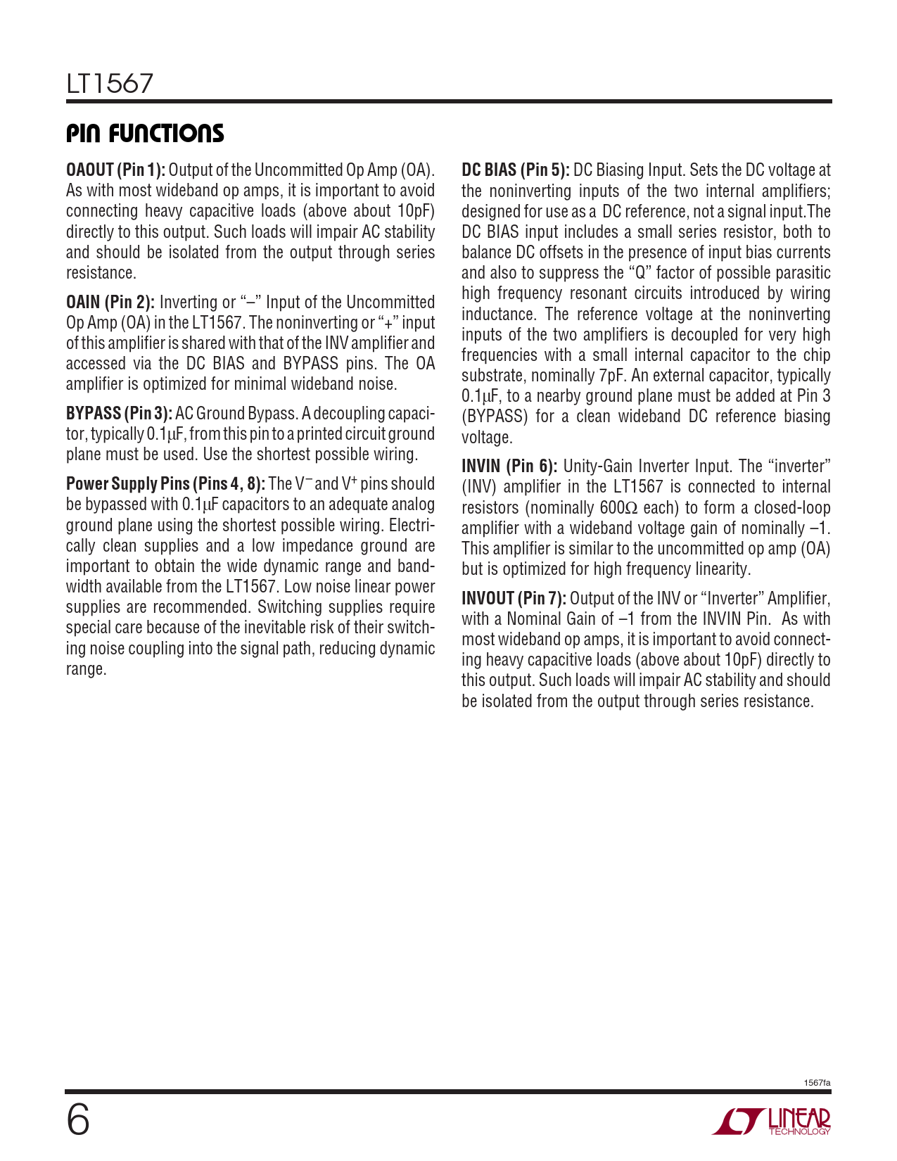 PI FU CTIO S. OAOUT (Pin 1):. DC BIAS (Pin 5):. OAIN (Pin 2):. BYPASS (Pin 3):. INVIN (Pin 6):. Power Supply Pins (Pins 4, 8):