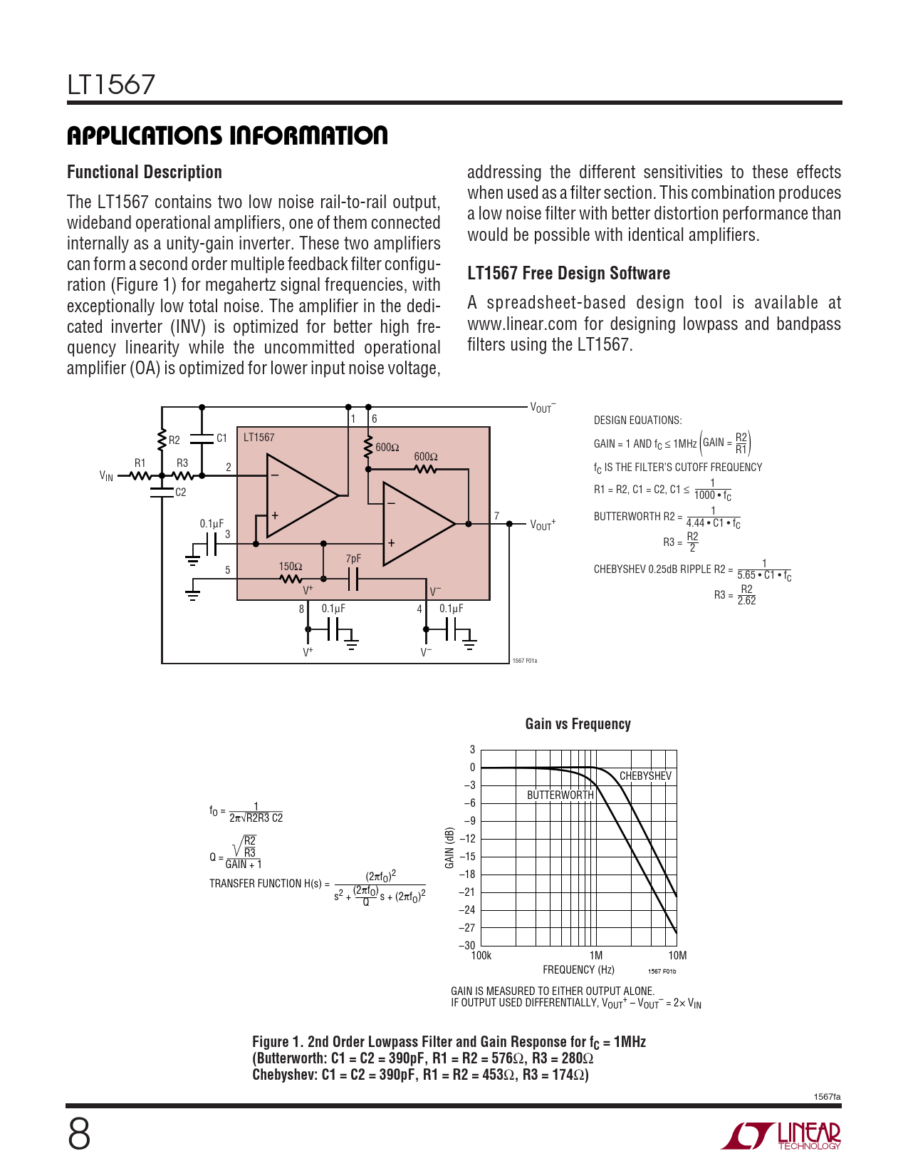 LT1567 UUWUAPPLICATIO S I FOR ATIOFunctional Description addressing the different sensitivities to these effects when used as a filter section. This combination produces The LT1567 contains two low noise rail-to-rail output, a low noise filter with better distortion performance than wideband operational amplifiers, one of them connected would be possible with identical amplifiers. internally as a unity-gain inverter. These two amplifiers can form a second order multiple feedback filter configu- LT1567 Free Design Software ration (Figure 1) for megahertz signal frequencies, with exceptionally low total noise. The amplifier in the dedi- A spreadsheet-based design tool is available at cated inverter (INV) is optimized for better high fre- www.linear.com for designing lowpass and bandpass quency linearity while the uncommitted operational filters using the LT1567. amplifier (OA) is optimized for lower input noise voltage, V – OUT 1 6 DESIGN EQUATIONS: R2 C1 LT1567 R2 (GAIN = ) 600Ω GAIN = 1 AND fC ≤ 1MHz R1 600Ω R1 R3 2 – fC IS THE FILTER’S CUTOFF FREQUENCY VIN 1 R1 = R2, C1 = C2, C1 C2 ≤ 1000 • f – C + 7 1 BUTTERWORTH R2 = 0.1µF V + 4.44 • C1 • f OUT C 3 + R2 R3 = 2 7pF 1 5 150Ω CHEBYSHEV 0.25dB RIPPLE R2 = 5.65 • C1 • fC V+ R2 V– R3 = 2.62 8 0.1µF 4 0.1µF V+ V– 1567 F01a Gain vs Frequency 3 0 CHEBYSHEV –3 BUTTERWORTH –6 f 1 O = 2π√R2R3 C2 –9 –12 R2 Q = R3 –15 GAIN + 1 GAIN (dB) –18 (2πf TRANSFER FUNCTION H(s) = O)2 (2πfO) –21 s2 + s + (2πf Q O)2 –24 –27 –30 100k 1M 10M FREQUENCY (Hz) 1567 F01b GAIN IS MEASURED TO EITHER OUTPUT ALONE. IF OUTPUT USED DIFFERENTIALLY, V + – OUT – VOUT = 2× VIN Figure 1. 2nd Order Lowpass Filter and Gain Response for fC = 1MHz(Butterworth: C1 = C2 = 390pF, R1 = R2 = 576 Ω , R3 = 280 Ω Chebyshev: C1 = C2 = 390pF, R1 = R2 = 453 Ω , R3 = 174 Ω ) 1567fa 8