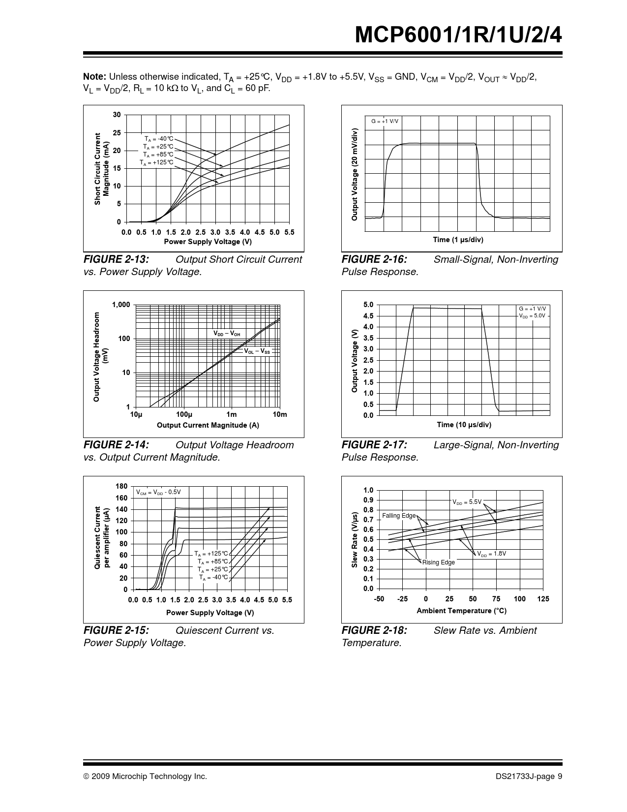 Slew Rate vs. Ambient Power Supply Voltage. Temperature. © 2009 Microchip Technology Inc. DS21733J-page 9 Document Outline 1.0 Electrical Characteristics 1.1 Test Circuits FIGURE 1-1: AC and DC Test Circuit for Most Specifications. 2.0 Typical Performance Curves FIGURE 2-1: Input Offset Voltage. FIGURE 2-2: Input Offset Voltage Drift. FIGURE 2-3: Input Offset Quadratic Temp. Co. FIGURE 2-4: Input Offset Voltage vs. Common Mode Input Voltage at VDD = 1.8V. FIGURE 2-5: Input Offset Voltage vs. Common Mode Input Voltage at VDD = 5.5V. FIGURE 2-6: Input Offset Voltage vs. Output Voltage. FIGURE 2-7: Input Bias Current at +85°C. FIGURE 2-8: Input Bias Current at +125°C. FIGURE 2-9: CMRR, PSRR vs. Ambient Temperature. FIGURE 2-10: PSRR, CMRR vs. Frequency. FIGURE 2-11: Open-Loop Gain, Phase vs. Frequency. FIGURE 2-12: Input Noise Voltage Density vs. Frequency. FIGURE 2-13: Output Short Circuit Current vs. Power Supply Voltage. FIGURE 2-14: Output Voltage Headroom vs. Output Current Magnitude. FIGURE 2-15: Quiescent Current vs. Power Supply Voltage. FIGURE 2-16: Small-Signal, Non-Inverting Pulse Response. FIGURE 2-17: Large-Signal, Non-Inverting Pulse Response. FIGURE 2-18: Slew Rate vs. Ambient Temperature. FIGURE 2-19: Output Voltage Swing vs. Frequency. FIGURE 2-20: Measured Input Current vs. Input Voltage (below VSS). FIGURE 2-21: The MCP6001/2/4 Show No Phase Reversal. 3.0 Pin Descriptions TABLE 3-1: Pin Function Table 3.1 Analog Outputs 3.2 Analog Inputs 3.3 Power Supply Pins 3.4 Exposed Thermal Pad (EP) 4.0 Application Information 4.1 Rail-to-Rail Inputs FIGURE 4-1: Simplified Analog Input ESD Structures. FIGURE 4-2: Protecting the Analog Inputs. 4.2 Rail-to-Rail Output 4.3 Capacitive Loads FIGURE 4-3: Output resistor, RISO stabilizes large capacitive loads. FIGURE 4-4: Recommended RISO values for Capacitive Loads. 4.4 Supply Bypass 4.5 Unused Op Amps FIGURE 4-5: Unused Op Amps. 4.6 PCB Surface Leakage FIGURE 4-6: Example Guard Ring Layout for Inverting Gain. 4.7 Application Circuits FIGURE 4-7: Instrumentation Amplifier with Unity-Gain Buffer Inputs. FIGURE 4-8: Active Second-Order Low-Pass Filter. FIGURE 4-9: Peak Detector with Clear and Sample CMOS Analog Switches. 5.0 Design AIDS 5.1 SPICE Macro Model 5.2 FilterLab® Software 5.3 Mindi™ Circuit Designer & Simulator 5.4 Microchip Advanced Part Selector (MAPS) 5.5 Analog Demonstration and Evaluation Boards 5.6 Application Notes 6.0 Packaging Information 6.1 Package Marking Information