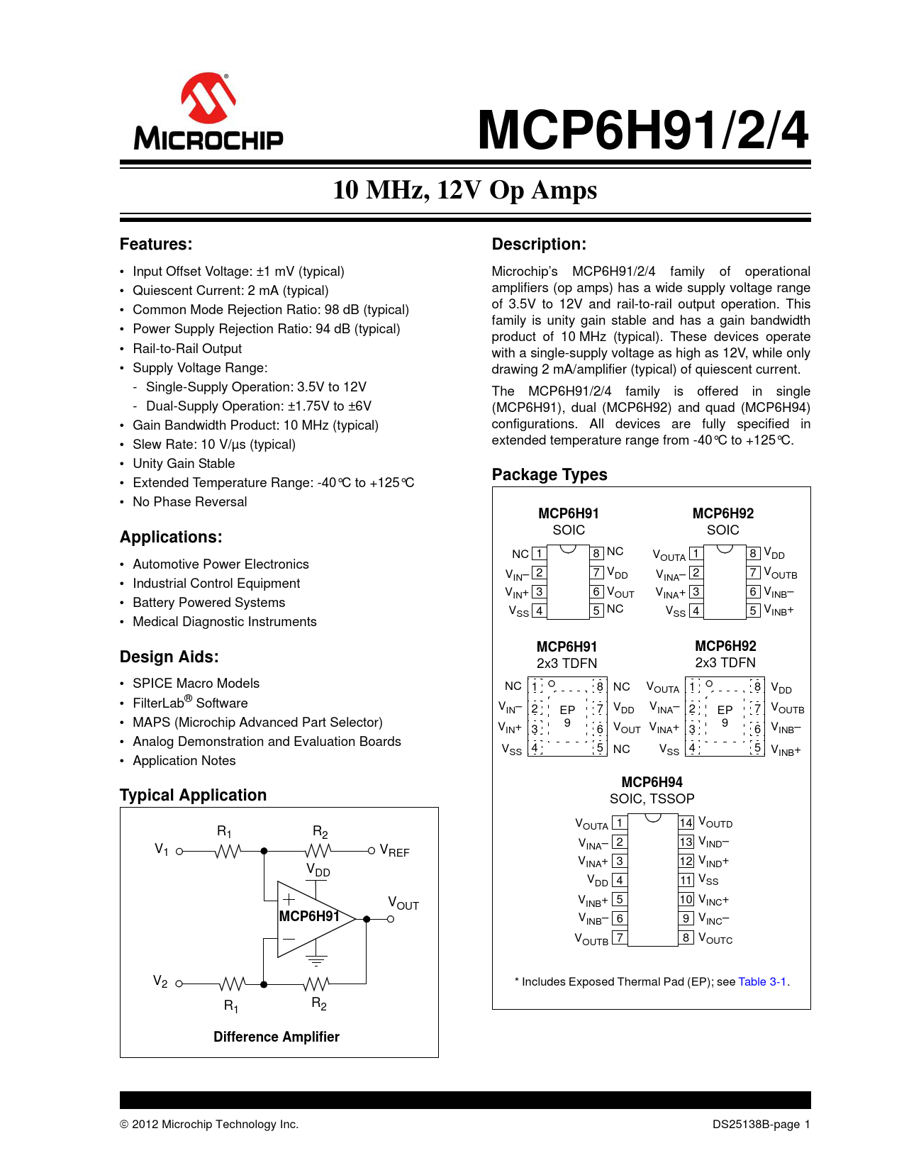 MCP6H91/2/4. 10 MHz, 12V Op Amps. Features:. Description:. Package Types. MCP6H91. MCP6H92. Applications:. Design Aids:. MCP6H94
