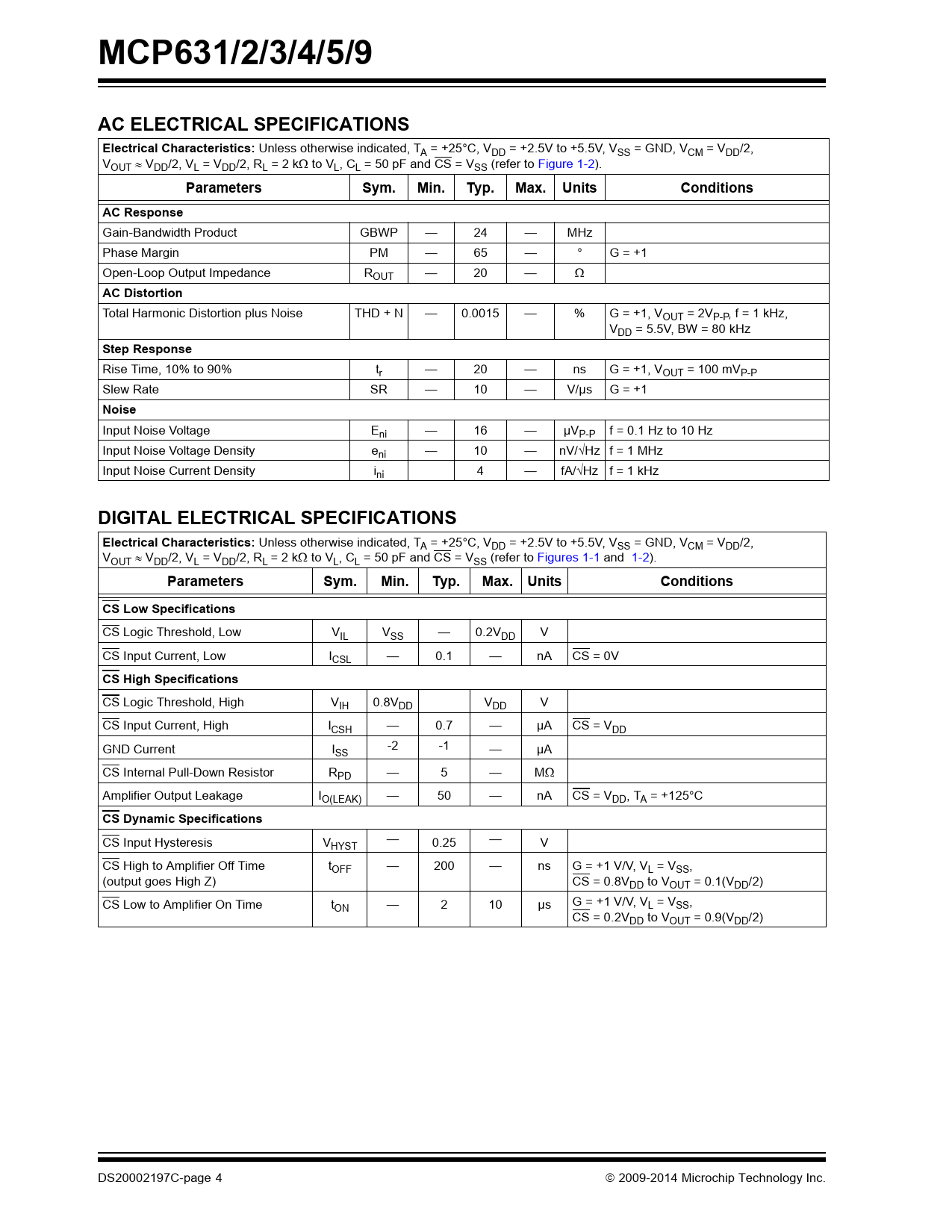 CS Input Hysteresis V — HYST 0.25 — V CS High to Amplifier Off Time tOFF — 200 — ns G = +1 V/V, VL = VSS, (output goes High Z) CS = 0.8VDD to VOUT = 0.1(VDD/2) CS Low to Amplifier On Time tON — 2 10 µs G = +1 V/V, VL = VSS, CS = 0.2VDD to VOUT = 0.9(VDD/2) DS20002197C-page 4  2009-2014 Microchip Technology Inc. Document Outline 24 MHz, 2.5 mA Rail-to-Rail Output (RRO) Op Amps Features: Typical Applications: Design Aids: Description: Typical Application Circuit High Gain-Bandwidth Op Amp Portfolio Package Types 1.0 Electrical Characteristics 1.1 Absolute Maximum Ratings † 1.2 Specifications DC Electrial Specifications AC Electrical Specifications Digital Electrical Specifications Temperature Specifications 1.3 Timing Diagram FIGURE 1-1: Timing Diagram. 1.4 Test Circuits FIGURE 1-2: AC and DC Test Circuit for Most Specifications. 2.0 Typical Performance Curves 2.1 DC Signal Inputs FIGURE 2-1: Input Offset Voltage. FIGURE 2-2: Input Offset Voltage Drift. FIGURE 2-3: Input Offset Voltage vs. Power Supply Voltage with VCM = 0V. FIGURE 2-4: Input Offset Voltage vs. Output Voltage. FIGURE 2-5: Low-Input Common-Mode Voltage Headroom vs. Ambient Temperature. FIGURE 2-6: High-Input Common-Mode Voltage Headroom vs. Ambient Temperature. FIGURE 2-7: Input Offset Voltage vs. Common-Mode Voltage with VDD = 2.5V. FIGURE 2-8: Input Offset Voltage vs. Common-Mode Voltage with VDD = 5.5V. FIGURE 2-9: CMRR and PSRR vs. Ambient Temperature. FIGURE 2-10: DC Open-Loop Gain vs. Ambient Temperature. FIGURE 2-11: DC Open-Loop Gain vs. Load Resistance. FIGURE 2-12: Input Bias and Offset Currents vs. Ambient Temperature with VDD = 5.5V. FIGURE 2-13: Input Bias Current vs. Input Voltage (below VSS). FIGURE 2-14: Input Bias and Offset Currents vs. Common-Mode Input Voltage with TA = +85°C. FIGURE 2-15: Input Bias and Offset Currents vs. Common-Mode Input Voltage with TA = +125°C. 2.2 Other DC Voltages and Currents FIGURE 2-16: Output Voltage Headroom vs. Output Current. FIGURE 2-17: Output Voltage Headroom vs. Ambient Temperature. FIGURE 2-18: Output Short-Circuit Current vs. Power Supply Voltage. FIGURE 2-19: Supply Current vs. Power Supply Voltage. FIGURE 2-20: Supply Current vs. Common-Mode Input Voltage. 2.3 Frequency Response FIGURE 2-21: CMRR and PSRR vs. Frequency. FIGURE 2-22: Open-Loop Gain vs. Frequency. FIGURE 2-23: Gain-Bandwidth Product and Phase Margin vs. Ambient Temperature. FIGURE 2-24: Gain-Bandwidth Product and Phase Margin vs. Common-Mode Input Voltage. FIGURE 2-25: Gain-Bandwidth Product and Phase Margin vs. Output Voltage. FIGURE 2-26: Closed-Loop Output Impedance vs. Frequency. FIGURE 2-27: Gain Peaking vs. Normalized Capacitive Load. FIGURE 2-28: Channel-to-Channel Separation vs. Frequency. 2.4 Noise and Distortion FIGURE 2-29: Input Noise Voltage Density vs. Frequency. FIGURE 2-30: Input Noise Voltage Density vs. Input Common-Mode Voltage with f = 100 Hz. FIGURE 2-31: Input Noise Voltage Density vs. Input Common-Mode Voltage with f = 1 MHz. FIGURE 2-32: Input Noise vs. Time with 0.1 Hz Filter. FIGURE 2-33: THD+N vs. Frequency. 2.5 Time Response FIGURE 2-34: Non-Inverting Small Signal Step Response. FIGURE 2-35: Non-Inverting Large Signal Step Response. FIGURE 2-36: Inverting Small Signal Step Response. FIGURE 2-37: Inverting Large Signal Step Response. FIGURE 2-38: The MCP631/2/3/4/5/9 Family Shows No Input Phase Reversal With Overdrive. FIGURE 2-39: Slew Rate vs. Ambient Temperature. FIGURE 2-40: Maximum Output Voltage Swing vs. Frequency. 2.6 Chip Select Response FIGURE 2-41: CS Current vs. Power Supply Voltage. FIGURE 2-42: CS and Output Voltages vs. Time with VDD = 2.5V. FIGURE 2-43: CS and Output Voltages vs. Time with VDD = 5.5V. FIGURE 2-44: CS Hysteresis vs. Ambient Temperature. FIGURE 2-45: CS Turn-On Time vs. Ambient Temperature. FIGURE 2-46: CS Pull-Down Resistor (RPD) vs. Ambient Temperature. FIGURE 2-47: Quiescent Current in Shutdown vs. Power Supply Voltage. FIGURE 2-48: Output Leakage Current vs. Output Voltage. 3.0 Pin Descriptions TABLE 3-1: Pin Function Table 3.1 Analog Outputs 3.2 Analog Inputs 3.3 Power Supply Pins 3.4 Chip Select Digital Input (CS) 3.5 Exposed Thermal Pad (EP) 4.0 Applications 4.1 Input FIGURE 4-1: Simplified Analog Input ESD Structures. FIGURE 4-2: Protecting the Analog Inputs. FIGURE 4-3: Unity-Gain Voltage Limitations for Linear Operation. 4.2 Rail-to-Rail Output FIGURE 4-4: Output Current. FIGURE 4-5: Diagram for Power Calculations. 4.3 Improving Stability FIGURE 4-6: Output Resistor, RISO, Stabilizes Large Capacitive Loads. FIGURE 4-7: Recommended RISO Values for Capacitive Loads. FIGURE 4-8: Amplifier with Parasitic Capacitance. FIGURE 4-9: Maximum Recommended RF vs. Gain. 4.4 MCP633, MCP635 and MCP639 Chip Select 4.5 Power Supply 4.6 High-Speed PCB Layout 4.7 Typical Applications FIGURE 4-10: Power Driver. FIGURE 4-11: Transimpedance Amplifier for an Optical Detector. FIGURE 4-12: H-Bridge Driver. 5.0 Design Aids 5.1 SPICE Macro Model 5.2 FilterLab® Software 5.3 Microchip Advanced Part Selector (MAPS) 5.4 Analog Demonstration and Evaluation Boards 5.5 Application Notes 6.0 Packaging Information 6.1 Package Marking Information Appendix A: Revision History Product Identification System Trademarks Worldwide Sales and Service