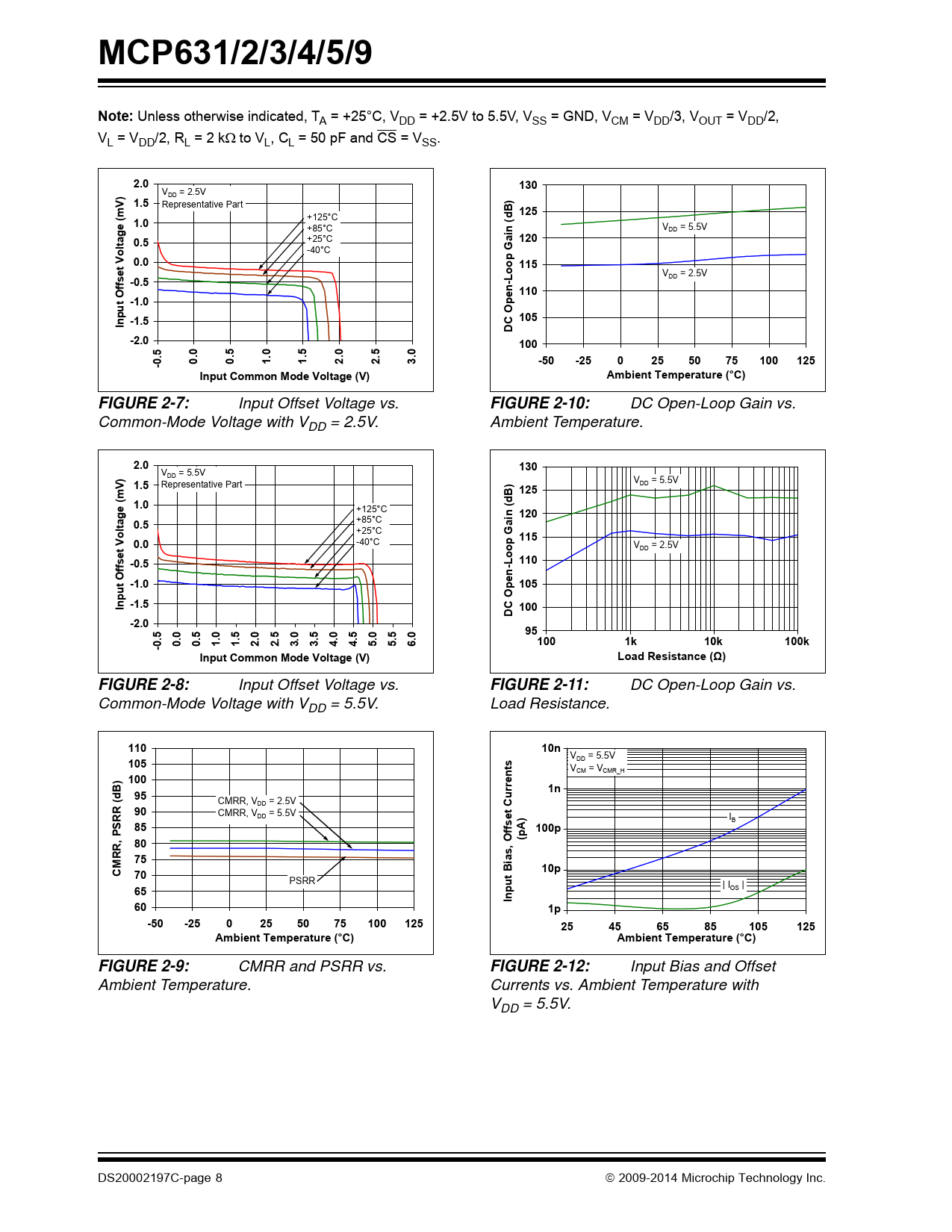 MCP631/2/3/4/5/9Note: Unless otherwise indicated, TA = +25°C, VDD = +2.5V to 5.5V, VSS = GND, VCM = VDD/3, VOUT = VDD/2, VL = VDD/2, RL = 2 kto VL, CL = 50 pF and CS = VSS. 2.0130) VDD = 2.5V V 1.5 Representative Part ) B 125d1.0 +125°C e (m( +85°C in VDD = 5.5V ag 0.5 +25°C 120lt o -40°C 0.0op Ga 115o V -0.5 DD = 2.5V ffset V-L 110ent O -1.0u pOp-1.5105InC D-2.0100.50505050-00.0.1.1.2.2.3.-50-250255075100125Input Common Mode Voltage (V)Ambient Temperature (°C)FIGURE 2-7: Input Offset Voltage vs. FIGURE 2-10: DC Open-Loop Gain vs. Common-Mode Voltage with VDD = 2.5V. Ambient Temperature. 2.0130 VDD = 5.5V V) 1.5 Representative Part ) VDD = 5.5V B 125(m 1.0de +125°C ( in 1200.5 +85°C ltag o +25°C 115V 0.0 -40°C p Ga VDD = 2.5V etoo-0.5110ffs-L nt O -1.0105u pOpe-1.5InC 100D-2.095.50505050505050-00.0.1.1.2.2.3.3.4.4.5.5.6.1.E1 +00201.E+1 03k1.E+0410k1.E1 +0500kInput Common Mode Voltage (V)Load Resistance (Ω)FIGURE 2-8: Input Offset Voltage vs. FIGURE 2-11: DC Open-Loop Gain vs. Common-Mode Voltage with VDD = 5.5V. Load Resistance. 1101.E-0810n V 105 DD = 5.5V ts VCM = VCMR_H 100B)rren1.E-091n95u(d CMRR, V R DD = 2.5V 90t CR CMRR, VDD = 5.5V ) I S B 85ffseA1.E-10100pP(p80RR,75M C10p701.E-11t Bias, O PSRR u | I 65p OS | In601.E-121p-50-25025507510012525456585105125Ambient Temperature (°C)Ambient Temperature (°C)FIGURE 2-9: CMRR and PSRR vs. FIGURE 2-12: Input Bias and Offset Ambient Temperature. Currents vs. Ambient Temperature with VDD = 5.5V. DS20002197C-page 8 2009-2014 Microchip Technology Inc. Document Outline 24 MHz, 2.5 mA Rail-to-Rail Output (RRO) Op Amps Features: Typical Applications: Design Aids: Description: Typical Application Circuit High Gain-Bandwidth Op Amp Portfolio Package Types 1.0 Electrical Characteristics 1.1 Absolute Maximum Ratings † 1.2 Specifications DC Electrial Specifications AC Electrical Specifications Digital Electrical Specifications Temperature Specifications 1.3 Timing Diagram FIGURE 1-1: Timing Diagram. 1.4 Test Circuits FIGURE 1-2: AC and DC Test Circuit for Most Specifications. 2.0 Typical Performance Curves 2.1 DC Signal Inputs FIGURE 2-1: Input Offset Voltage. FIGURE 2-2: Input Offset Voltage Drift. FIGURE 2-3: Input Offset Voltage vs. Power Supply Voltage with VCM = 0V. FIGURE 2-4: Input Offset Voltage vs. Output Voltage. FIGURE 2-5: Low-Input Common-Mode Voltage Headroom vs. Ambient Temperature. FIGURE 2-6: High-Input Common-Mode Voltage Headroom vs. Ambient Temperature. FIGURE 2-7: Input Offset Voltage vs. Common-Mode Voltage with VDD = 2.5V. FIGURE 2-8: Input Offset Voltage vs. Common-Mode Voltage with VDD = 5.5V. FIGURE 2-9: CMRR and PSRR vs. Ambient Temperature. FIGURE 2-10: DC Open-Loop Gain vs. Ambient Temperature. FIGURE 2-11: DC Open-Loop Gain vs. Load Resistance. FIGURE 2-12: Input Bias and Offset Currents vs. Ambient Temperature with VDD = 5.5V. FIGURE 2-13: Input Bias Current vs. Input Voltage (below VSS). FIGURE 2-14: Input Bias and Offset Currents vs. Common-Mode Input Voltage with TA = +85°C. FIGURE 2-15: Input Bias and Offset Currents vs. Common-Mode Input Voltage with TA = +125°C. 2.2 Other DC Voltages and Currents FIGURE 2-16: Output Voltage Headroom vs. Output Current. FIGURE 2-17: Output Voltage Headroom vs. Ambient Temperature. FIGURE 2-18: Output Short-Circuit Current vs. Power Supply Voltage. FIGURE 2-19: Supply Current vs. Power Supply Voltage. FIGURE 2-20: Supply Current vs. Common-Mode Input Voltage. 2.3 Frequency Response FIGURE 2-21: CMRR and PSRR vs. Frequency. FIGURE 2-22: Open-Loop Gain vs. Frequency. FIGURE 2-23: Gain-Bandwidth Product and Phase Margin vs. Ambient Temperature. FIGURE 2-24: Gain-Bandwidth Product and Phase Margin vs. Common-Mode Input Voltage. FIGURE 2-25: Gain-Bandwidth Product and Phase Margin vs. Output Voltage. FIGURE 2-26: Closed-Loop Output Impedance vs. Frequency. FIGURE 2-27: Gain Peaking vs. Normalized Capacitive Load. FIGURE 2-28: Channel-to-Channel Separation vs. Frequency. 2.4 Noise and Distortion FIGURE 2-29: Input Noise Voltage Density vs. Frequency. FIGURE 2-30: Input Noise Voltage Density vs. Input Common-Mode Voltage with f = 100 Hz. FIGURE 2-31: Input Noise Voltage Density vs. Input Common-Mode Voltage with f = 1 MHz. FIGURE 2-32: Input Noise vs. Time with 0.1 Hz Filter. FIGURE 2-33: THD+N vs. Frequency. 2.5 Time Response FIGURE 2-34: Non-Inverting Small Signal Step Response. FIGURE 2-35: Non-Inverting Large Signal Step Response. FIGURE 2-36: Inverting Small Signal Step Response. FIGURE 2-37: Inverting Large Signal Step Response. FIGURE 2-38: The MCP631/2/3/4/5/9 Family Shows No Input Phase Reversal With Overdrive. FIGURE 2-39: Slew Rate vs. Ambient Temperature. FIGURE 2-40: Maximum Output Voltage Swing vs. Frequency. 2.6 Chip Select Response FIGURE 2-41: CS Current vs. Power Supply Voltage. FIGURE 2-42: CS and Output Voltages vs. Time with VDD = 2.5V. FIGURE 2-43: CS and Output Voltages vs. Time with VDD = 5.5V. FIGURE 2-44: CS Hysteresis vs. Ambient Temperature. FIGURE 2-45: CS Turn-On Time vs. Ambient Temperature. FIGURE 2-46: CS Pull-Down Resistor (RPD) vs. Ambient Temperature. FIGURE 2-47: Quiescent Current in Shutdown vs. Power Supply Voltage. FIGURE 2-48: Output Leakage Current vs. Output Voltage. 3.0 Pin Descriptions TABLE 3-1: Pin Function Table 3.1 Analog Outputs 3.2 Analog Inputs 3.3 Power Supply Pins 3.4 Chip Select Digital Input (CS) 3.5 Exposed Thermal Pad (EP) 4.0 Applications 4.1 Input FIGURE 4-1: Simplified Analog Input ESD Structures. FIGURE 4-2: Protecting the Analog Inputs. FIGURE 4-3: Unity-Gain Voltage Limitations for Linear Operation. 4.2 Rail-to-Rail Output FIGURE 4-4: Output Current. FIGURE 4-5: Diagram for Power Calculations. 4.3 Improving Stability FIGURE 4-6: Output Resistor, RISO, Stabilizes Large Capacitive Loads. FIGURE 4-7: Recommended RISO Values for Capacitive Loads. FIGURE 4-8: Amplifier with Parasitic Capacitance. FIGURE 4-9: Maximum Recommended RF vs. Gain. 4.4 MCP633, MCP635 and MCP639 Chip Select 4.5 Power Supply 4.6 High-Speed PCB