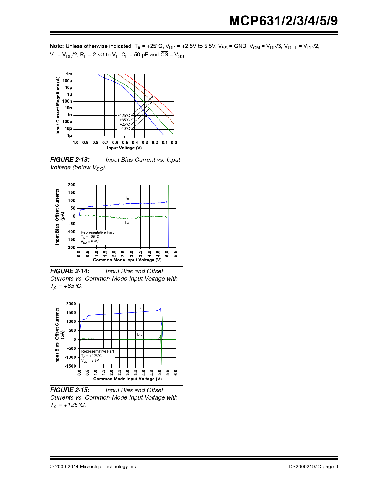 Input Bias and Offset Currents vs. Common-Mode Input Voltage with TA = +125°C.  2009-2014 Microchip Technology Inc. DS20002197C-page 9 Document Outline 24 MHz, 2.5 mA Rail-to-Rail Output (RRO) Op Amps Features: Typical Applications: Design Aids: Description: Typical Application Circuit High Gain-Bandwidth Op Amp Portfolio Package Types 1.0 Electrical Characteristics 1.1 Absolute Maximum Ratings † 1.2 Specifications DC Electrial Specifications AC Electrical Specifications Digital Electrical Specifications Temperature Specifications 1.3 Timing Diagram FIGURE 1-1: Timing Diagram. 1.4 Test Circuits FIGURE 1-2: AC and DC Test Circuit for Most Specifications. 2.0 Typical Performance Curves 2.1 DC Signal Inputs FIGURE 2-1: Input Offset Voltage. FIGURE 2-2: Input Offset Voltage Drift. FIGURE 2-3: Input Offset Voltage vs. Power Supply Voltage with VCM = 0V. FIGURE 2-4: Input Offset Voltage vs. Output Voltage. FIGURE 2-5: Low-Input Common-Mode Voltage Headroom vs. Ambient Temperature. FIGURE 2-6: High-Input Common-Mode Voltage Headroom vs. Ambient Temperature. FIGURE 2-7: Input Offset Voltage vs. Common-Mode Voltage with VDD = 2.5V. FIGURE 2-8: Input Offset Voltage vs. Common-Mode Voltage with VDD = 5.5V. FIGURE 2-9: CMRR and PSRR vs. Ambient Temperature. FIGURE 2-10: DC Open-Loop Gain vs. Ambient Temperature. FIGURE 2-11: DC Open-Loop Gain vs. Load Resistance. FIGURE 2-12: Input Bias and Offset Currents vs. Ambient Temperature with VDD = 5.5V. FIGURE 2-13: Input Bias Current vs. Input Voltage (below VSS). FIGURE 2-14: Input Bias and Offset Currents vs. Common-Mode Input Voltage with TA = +85°C. FIGURE 2-15: Input Bias and Offset Currents vs. Common-Mode Input Voltage with TA = +125°C. 2.2 Other DC Voltages and Currents FIGURE 2-16: Output Voltage Headroom vs. Output Current. FIGURE 2-17: Output Voltage Headroom vs. Ambient Temperature. FIGURE 2-18: Output Short-Circuit Current vs. Power Supply Voltage. FIGURE 2-19: Supply Current vs. Power Supply Voltage. FIGURE 2-20: Supply Current vs. Common-Mode Input Voltage. 2.3 Frequency Response FIGURE 2-21: CMRR and PSRR vs. Frequency. FIGURE 2-22: Open-Loop Gain vs. Frequency. FIGURE 2-23: Gain-Bandwidth Product and Phase Margin vs. Ambient Temperature. FIGURE 2-24: Gain-Bandwidth Product and Phase Margin vs. Common-Mode Input Voltage. FIGURE 2-25: Gain-Bandwidth Product and Phase Margin vs. Output Voltage. FIGURE 2-26: Closed-Loop Output Impedance vs. Frequency. FIGURE 2-27: Gain Peaking vs. Normalized Capacitive Load. FIGURE 2-28: Channel-to-Channel Separation vs. Frequency. 2.4 Noise and Distortion FIGURE 2-29: Input Noise Voltage Density vs. Frequency. FIGURE 2-30: Input Noise Voltage Density vs. Input Common-Mode Voltage with f = 100 Hz. FIGURE 2-31: Input Noise Voltage Density vs. Input Common-Mode Voltage with f = 1 MHz. FIGURE 2-32: Input Noise vs. Time with 0.1 Hz Filter. FIGURE 2-33: THD+N vs. Frequency. 2.5 Time Response FIGURE 2-34: Non-Inverting Small Signal Step Response. FIGURE 2-35: Non-Inverting Large Signal Step Response. FIGURE 2-36: Inverting Small Signal Step Response. FIGURE 2-37: Inverting Large Signal Step Response. FIGURE 2-38: The MCP631/2/3/4/5/9 Family Shows No Input Phase Reversal With Overdrive. FIGURE 2-39: Slew Rate vs. Ambient Temperature. FIGURE 2-40: Maximum Output Voltage Swing vs. Frequency. 2.6 Chip Select Response FIGURE 2-41: CS Current vs. Power Supply Voltage. FIGURE 2-42: CS and Output Voltages vs. Time with VDD = 2.5V. FIGURE 2-43: CS and Output Voltages vs. Time with VDD = 5.5V. FIGURE 2-44: CS Hysteresis vs. Ambient Temperature. FIGURE 2-45: CS Turn-On Time vs. Ambient Temperature. FIGURE 2-46: CS Pull-Down Resistor (RPD) vs. Ambient Temperature. FIGURE 2-47: Quiescent Current in Shutdown vs. Power Supply Voltage. FIGURE 2-48: Output Leakage Current vs. Output Voltage. 3.0 Pin Descriptions TABLE 3-1: Pin Function Table 3.1 Analog Outputs 3.2 Analog Inputs 3.3 Power Supply Pins 3.4 Chip Select Digital Input (CS) 3.5 Exposed Thermal Pad (EP) 4.0 Applications 4.1 Input FIGURE 4-1: Simplified Analog Input ESD Structures. FIGURE 4-2: Protecting the Analog Inputs. FIGURE 4-3: Unity-Gain Voltage Limitations for Linear Operation. 4.2 Rail-to-Rail Output FIGURE 4-4: Output Current. FIGURE 4-5: Diagram for Power Calculations. 4.3 Improving Stability FIGURE 4-6: Output Resistor, RISO, Stabilizes Large Capacitive Loads. FIGURE 4-7: Recommended RISO Values for Capacitive Loads. FIGURE 4-8: Amplifier with Parasitic Capacitance. FIGURE 4-9: Maximum Recommended RF vs. Gain. 4.4 MCP633, MCP635 and MCP639 Chip Select 4.5 Power Supply 4.6 High-Speed PCB Layout 4.7 Typical Applications FIGURE 4-10: Power Driver. FIGURE 4-11: Transimpedance Amplifier for an Optical Detector. FIGURE 4-12: H-Bridge Driver. 5.0 Design Aids 5.1 SPICE Macro Model 5.2 FilterLab® Software 5.3 Microchip Advanced Part Selector (MAPS) 5.4 Analog Demonstration and Evaluation Boards 5.5 Application Notes 6.0 Packaging Information 6.1 Package Marking Information Appendix A: Revision History Product Identification System Trademarks Worldwide Sales and Service