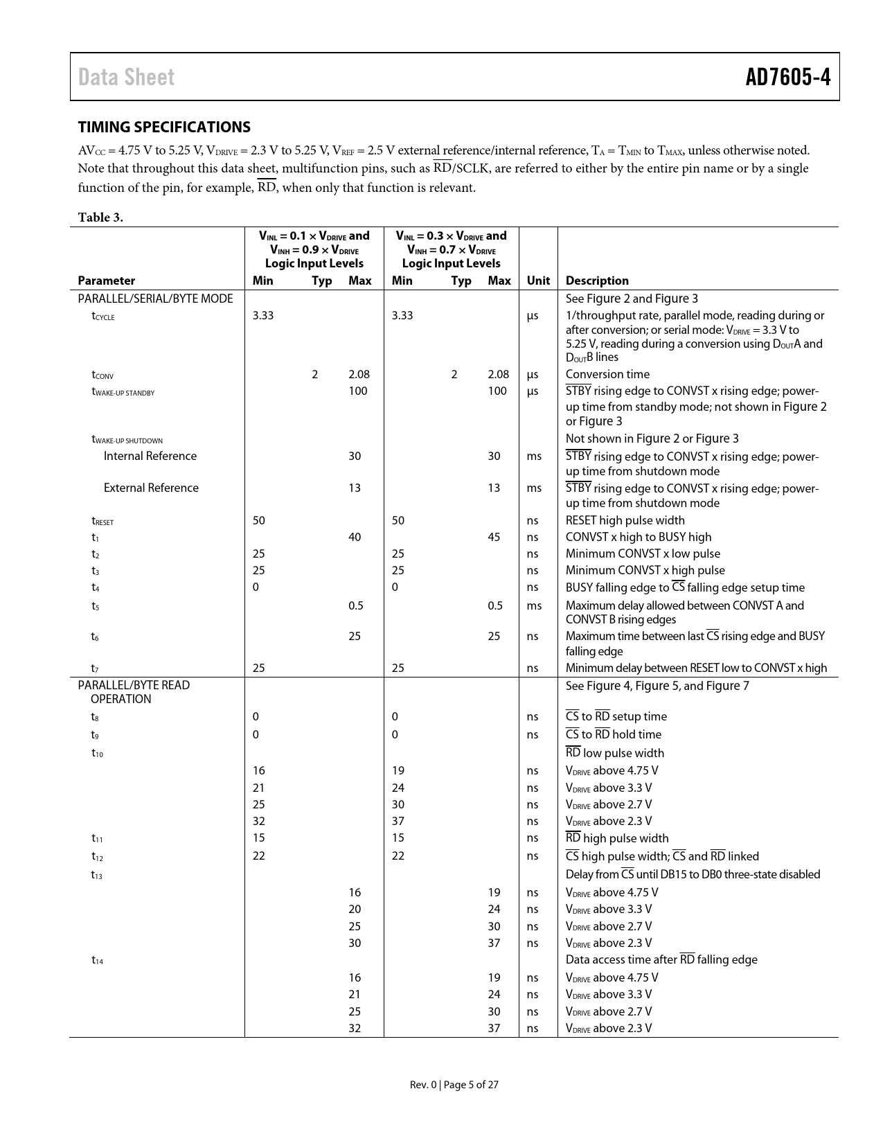 Data Sheet AD7605-4 TIMING SPECIFICATIONS Table 3 VINL = 0.1 × VDRIVE and VINL = 0.3 × VDRIVE and VINH = 0.9 × VDRIVE