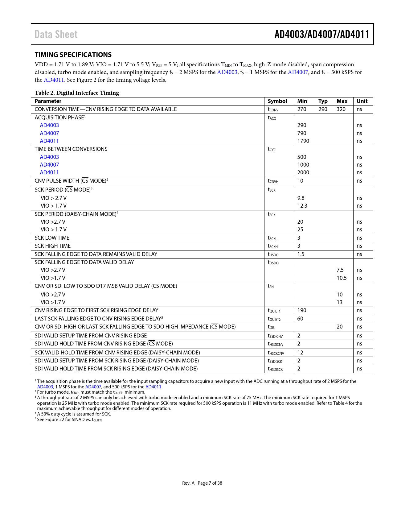 link to page 8 link to page 8 link to page 13 Data SheetAD4003/AD4007/AD4011TIMING SPECIFICATIONS VDD = 1.71 V to 1.89 V; VIO = 1.71 V to 5.5 V; VREF = 5 V; all specifications TMIN to TMAX, high-Z mode disabled, span compression disabled, turbo mode enabled, and sampling frequency fS = 2 MSPS for the AD4003, fS = 1 MSPS for the AD4007, and fS = 500 kSPS for the AD4011. See Figure 2 for the timing voltage levels. Table 2. Digital Interface Timing ParameterSymbol Min Typ Max Unit CONVERSION TIME—CNV RISING EDGE TO DATA AVAILABLE tCONV 270 290 320 ns ACQUISITION PHASE1 tACQ AD4003 290 ns AD4007 790 ns AD4011 1790 ns TIME BETWEEN CONVERSIONS tCYC AD4003 500 ns AD4007 1000 ns AD4011 2000 ns CNV PULSE WIDTH (CS MODE)2 tCNVH 10 ns SCK PERIOD (CS MODE)3 tSCK VIO > 2.7 V 9.8 ns VIO > 1.7 V 12.3 ns SCK PERIOD (DAISY-CHAIN MODE)4 tSCK VIO >2.7 V 20 ns VIO > 1.7 V 25 ns SCK LOW TIME tSCKL 3 ns SCK HIGH TIME tSCKH 3 ns SCK FALLING EDGE TO DATA REMAINS VALID DELAY tHSDO 1.5 ns SCK FALLING EDGE TO DATA VALID DELAY tDSDO VIO >2.7 V 7.5 ns VIO >1.7 V 10.5 ns CNV OR SDI LOW TO SDO D17 MSB VALID DELAY (CS MODE) tEN VIO >2.7 V 10 ns VIO >1.7 V 13 ns CNV RISING EDGE TO FIRST SCK RISING EDGE DELAY tQUIET1 190 ns LAST SCK FALLING EDGE TO CNV RISING EDGE DELAY5 tQUIET2 60 ns CNV OR SDI HIGH OR LAST SCK FALLING EDGE TO SDO HIGH IMPEDANCE (CS MODE) tDIS 20 ns SDI VALID SETUP TIME FROM CNV RISING EDGE tSSDICNV 2 ns SDI VALID HOLD TIME FROM CNV RISING EDGE (CS MODE) tHSDICNV 2 ns SCK VALID HOLD TIME FROM CNV RISING EDGE (DAISY-CHAIN MODE) tHSCKCNV 12 ns SDI VALID SETUP TIME FROM SCK RISING EDGE (DAISY-CHAIN MODE) tSSDISCK 2 ns SDI VALID HOLD TIME FROM SCK RISING EDGE (DAISY-CHAIN MODE) tHSDISCK 2 ns 1 The acquisition phase is the time available for the input sampling capacitors to acquire a new input with the ADC running at a throughput rate of 2 MSPS for the AD4003, 1 MSPS for the AD4007, and 500 kSPS for the AD4011. 2 For turbo mode, tCNVH must match the tQUIET1 minimum. 3 A throughput rate of 2 MSPS can only be achieved with turbo mode enabled and a minimum SCK rate of 75 MHz. The minimum SCK rate required for 1 MSPS operation is 25 MHz with turbo mode enabled. The minimum SCK rate required for 500 kSPS operation is 11 MHz with turbo mode enabled. Refer to Table 4 for the maximum achievable throughput for different modes of operation. 4 A 50% duty cycle is assumed for SCK. 5 See Figure 22 for SINAD vs. tQUIET2. Rev. A | Page 7 of 38 Document Outline Features Applications General Description Table of Contents Revision History Functional Block Diagram Specifications Timing Specifications Absolute Maximum Ratings Thermal Resistance ESD Caution Pin Configurations and Function Descriptions Typical Performance Characteristics Terminology Theory of Operation Circuit Information Converter Operation Transfer Functions Applications Information Typical Application Diagrams Analog Inputs Input Overvoltage Clamp Circuit Differential Input Considerations Switched Capacitor Input RC Filter Values Driver Amplifier Choice Single to Differential Driver High Frequency Input Signals Multiplexed Applications Ease of Drive Features Input Span Compression High-Z Mode Long Acquisition Phase Voltage Reference Input Power Supply Digital Interface Register Read/Write Functionality Status Word /CS Mode, 3-Wire Turbo Mode /CS Mode, 3-Wire Without Busy Indicator /CS Mode, 3-Wire with Busy Indicator /CS Mode, 4-Wire Turbo Mode /CS Mode, 4-Wire Without Busy Indicator /CS Mode, 4-Wire with Busy Indicator Daisy-Chain Mode Layout Guidelines Evaluating the AD4003/AD4007/AD4011 Performance Outline Dimensions Ordering Guide