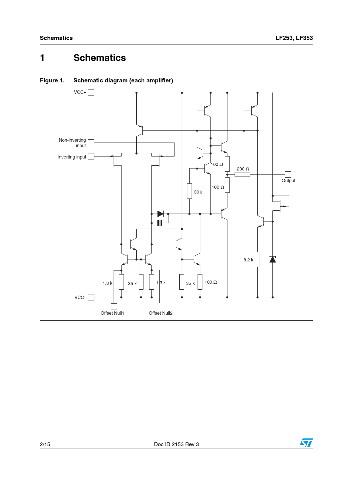SchematicsLF253, LF3531 SchematicsFigure 1.Schematic diagram (each amplifier) VCC+ Non-inverting input Inverting input 100 Ω 200 Ω Output 100 Ω 30 k 8.2 k 1.3 k 35 k 1.3 k 35 k 100 Ω VCC- Offset Null1 Offset Null2 2/15 Doc ID 2153 Rev 3 Document Outline 1 Schematics Figure 1. Schematic diagram (each amplifier) 2 Absolute maximum ratings and operating conditions Table 1. Absolute maximum ratings Table 2. Operating conditions 3 Electrical characteristics Table 3. Electrical characteristics at VCC = ±15 V, Tamb = +25˚C (unless otherwise specified) Figure 2. Maximum peak-to-peak output voltage vs. frequency, RL = 2 kW Figure 3. Maximum peak-to-peak output voltage vs. frequency, RL = 10 kW Figure 4. Maximum peak-to-peak output voltage versus frequency Figure 5. Maximum peak-to-peak output voltage versus free air temperature Figure 6. Maximum peak-to-peak output voltage versus load resistance Figure 7. Maximum peak-to-peak output voltage versus supply voltage Figure 8. Input bias current versus free air temperature Figure 9. Large signal differential voltage amplification versus free air temp. Figure 10. Large signal differential voltage amplification and phase shift versus frequency Figure 11. Total power dissipation versus free air temperature Figure 12. Supply current per amplifier versus free air temperature Figure 13. Supply current per amplifier versus supply voltage Figure 14. Common mode rejection ratio versus free air temperature Figure 15. Voltage follower large signal pulse response Figure 16. Output voltage versus elapsed time Figure 17. Equivalent input noise voltage versus frequency Figure 18. Total harmonic distortion versus frequency 4 Parameter measurement information Figure 19. Voltage follower Figure 20. Gain of 10 inverting amplifier 5 Typical application Figure 21. Quadruple oscillator 6 Package information 6.1 DIP8 package information Figure 22. DIP8 package mechanical drawing Table 4. DIP8 package mechanical data 6.2 SO-8 package information Figure 23. SO-8 package mechanical drawing Table 5. SO-8 package mechanical data 7 Ordering information Table 6. Order codes 8 Revision history Table 7. Document revision history