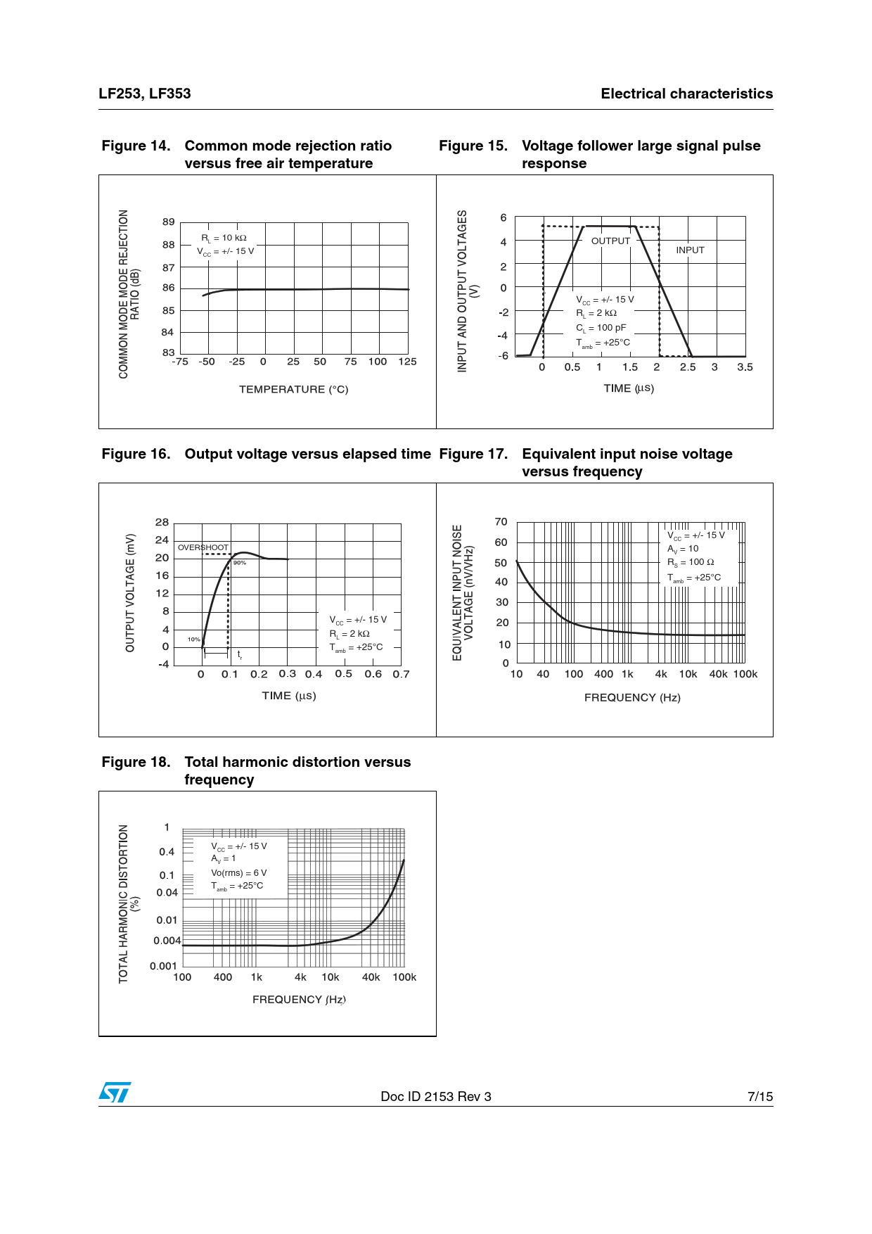 LF253, LF353Electrical characteristicsFigure 14.Common mode rejection ratioFigure 15.Voltage follower large signal pulseversus free air temperatureresponse R = 10 kΩ L OUTPUT V = +/- 15 V INPUT CC V = +/- 15 V CC R = 2 kΩ L C = 100 pF L T = +25°C amb μs Figure 16.Output voltage versus elapsed time Figure 17.Equivalent input noise voltage versus frequency V = +/- 15 V CC OVERSHOOT A = 10 V R = 100 Ω S T = +25°C amb V = +/- 15 V CC R = 2 kΩ L T = +25°C amb tr μs Figure 18.Total harmonic distortion versus frequency V = +/- 15 V CC A = 1 V Vo(rms) = 6 V T = +25°C amb Doc ID 2153 Rev 3 7/15 Document Outline 1 Schematics Figure 1. Schematic diagram (each amplifier) 2 Absolute maximum ratings and operating conditions Table 1. Absolute maximum ratings Table 2. Operating conditions 3 Electrical characteristics Table 3. Electrical characteristics at VCC = ±15 V, Tamb = +25˚C (unless otherwise specified) Figure 2. Maximum peak-to-peak output voltage vs. frequency, RL = 2 kW Figure 3. Maximum peak-to-peak output voltage vs. frequency, RL = 10 kW Figure 4. Maximum peak-to-peak output voltage versus frequency Figure 5. Maximum peak-to-peak output voltage versus free air temperature Figure 6. Maximum peak-to-peak output voltage versus load resistance Figure 7. Maximum peak-to-peak output voltage versus supply voltage Figure 8. Input bias current versus free air temperature Figure 9. Large signal differential voltage amplification versus free air temp. Figure 10. Large signal differential voltage amplification and phase shift versus frequency Figure 11. Total power dissipation versus free air temperature Figure 12. Supply current per amplifier versus free air temperature Figure 13. Supply current per amplifier versus supply voltage Figure 14. Common mode rejection ratio versus free air temperature Figure 15. Voltage follower large signal pulse response Figure 16. Output voltage versus elapsed time Figure 17. Equivalent input noise voltage versus frequency Figure 18. Total harmonic distortion versus frequency 4 Parameter measurement information Figure 19. Voltage follower Figure 20. Gain of 10 inverting amplifier 5 Typical application Figure 21. Quadruple oscillator 6 Package information 6.1 DIP8 package information Figure 22. DIP8 package mechanical drawing Table 4. DIP8 package mechanical data 6.2 SO-8 package information Figure 23. SO-8 package mechanical drawing Table 5. SO-8 package mechanical data 7 Ordering information Table 6. Order codes 8 Revision history Table 7. Document revision history