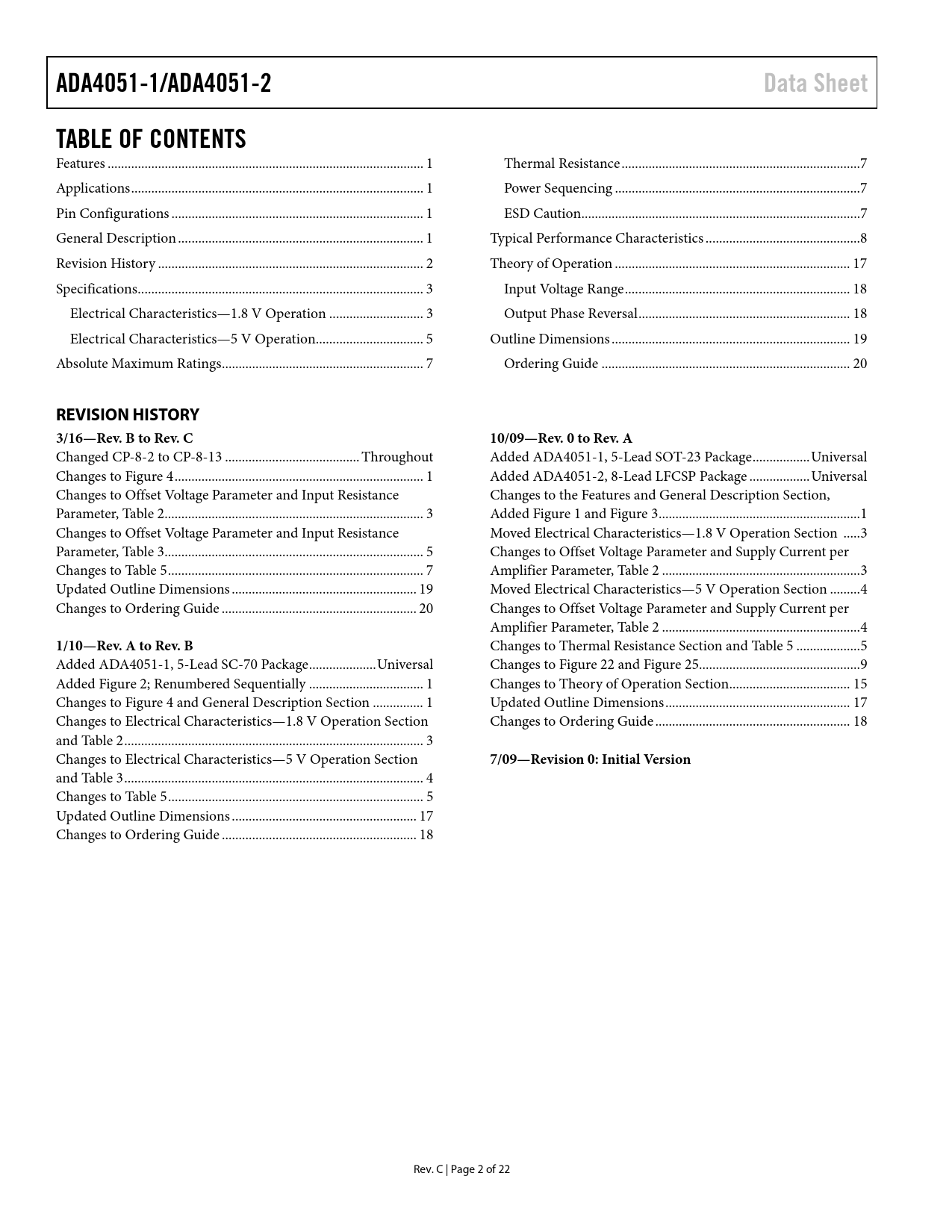 link to page 1 link to page 1 link to page 1 link to page 1 link to page 2 link to page 3 link to page 3 link to page 5 link to page 7 link to page 7 link to page 7 link to page 7 link to page 8 link to page 17 link to page 18 link to page 18 link to page 19 link to page 20 ADA4051-1/ADA4051-2Data SheetTABLE OF CONTENTS Features .. 1 Thermal Resistance ...7 Applications ... 1 Power Sequencing ...7 Pin Configurations ... 1 ESD Caution...7 General Description ... 1 Typical Performance Characteristics ..8 Revision History ... 2 Theory of Operation .. 17 Specifications ... 3 Input Voltage Range ... 18 Electrical Characteristics—1.8 V Operation .. 3 Output Phase Reversal ... 18 Electrical Characteristics—5 V Operation.. 5 Outline Dimensions ... 19 Absolute Maximum Ratings .. 7 Ordering Guide .. 20 REVISION HISTORY 3/16—Rev. B to Rev. C10/09—Rev. 0 to Rev. A Changed CP-8-2 to CP-8-13 .. Throughout Added ADA4051-1, 5-Lead SOT-23 Package ... Universal Changes to Figure 4 .. 1 Added ADA4051-2, 8-Lead LFCSP Package .. Universal Changes to Offset Voltage Parameter and Input Resistance Changes to the Features and General Description Section, Parameter, Table 2 ... 3 Added Figure 1 and Figure 3 .. 1 Changes to Offset Voltage Parameter and Input Resistance Moved Electrical Characteristics—1.8 V Operation Section ... 3 Parameter, Table 3 ... 5 Changes to Offset Voltage Parameter and Supply Current per Changes to Table 5 .. 7 Amplifier Parameter, Table 2 ... 3 Updated Outline Dimensions ... 19 Moved Electrical Characteristics—5 V Operation Section ... 4 Changes to Ordering Guide .. 20 Changes to Offset Voltage Parameter and Supply Current per Amplifier Parameter, Table 2 ... 4 1/10—Rev. A to Rev. B Changes to Thermal Resistance Section and Table 5 ... 5 Added ADA4051-1, 5-Lead SC-70 Package .. Universal Changes to Figure 22 and Figure 25.. 9 Added Figure 2; Renumbered Sequentially .. 1 Changes to Theory of Operation Section.. 15 Changes to Figure 4 and General Description Section ... 1 Updated Outline Dimensions ... 17 Changes to Electrical Characteristics—1.8 V Operation Section Changes to Ordering Guide .. 18 and Table 2 ... 3 Changes to Electrical Characteristics—5 V Operation Section 7/09—Revision 0: Initial Version and Table 3 ... 4 Changes to Table 5 .. 5 Updated Outline Dimensions ... 17 Changes to Ordering Guide .. 18 Rev. C | Page 2 of 22 Document Outline FEATURES APPLICATIONS PIN CONFIGURATIONS GENERAL DESCRIPTION TABLE OF CONTENTS REVISION HISTORY SPECIFICATIONS ELECTRICAL CHARACTERISTICS—1.8 V OPERATION ELECTRICAL CHARACTERISTICS—5 V OPERATION ABSOLUTE MAXIMUM RATINGS THERMAL RESISTANCE POWER SEQUENCING ESD CAUTION TYPICAL PERFORMANCE CHARACTERISTICS THEORY OF OPERATION INPUT VOLTAGE RANGE OUTPUT PHASE REVERSAL OUTLINE DIMENSIONS ORDERING GUIDE