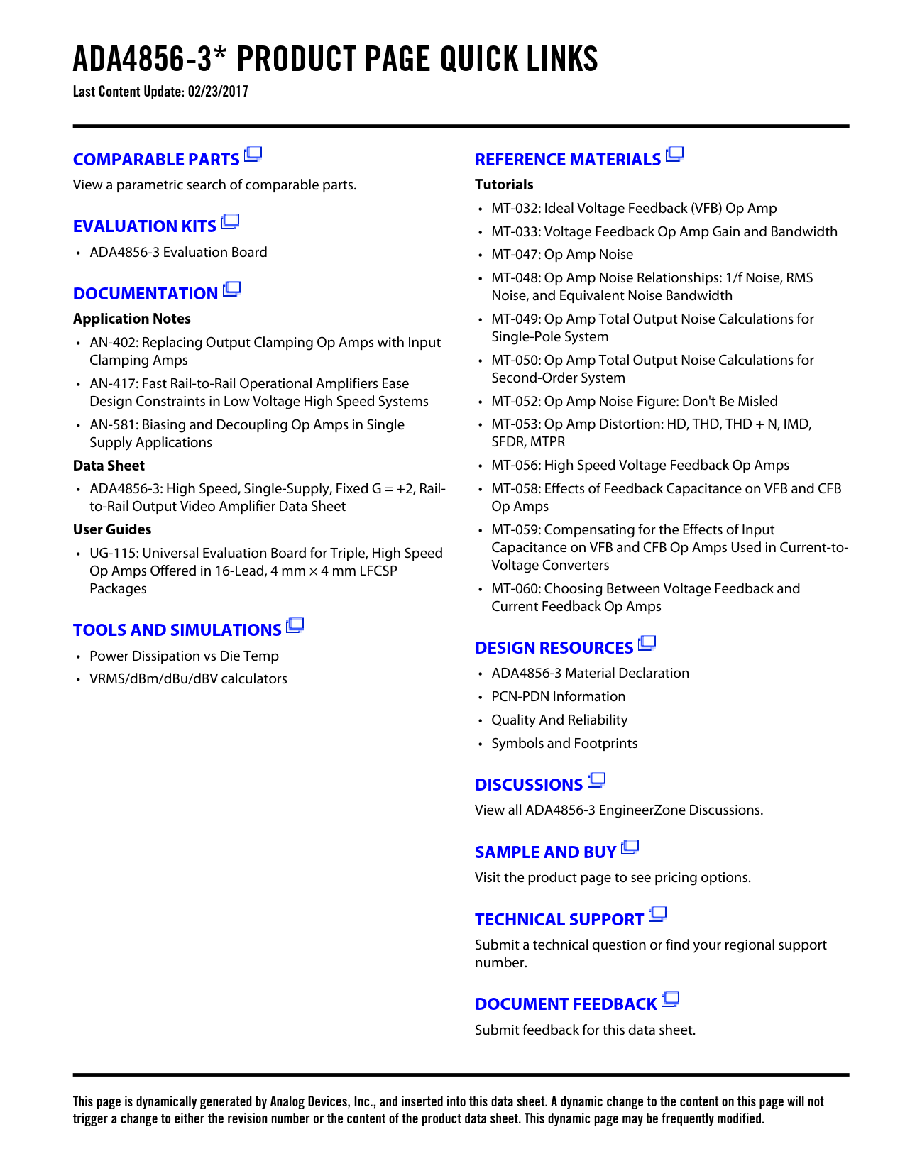ADA4856-3* PRODUCT PAGE QUICK LINKS Last Content Update: 02/23/2017. COMPARABLE PARTS. REFERENCE MATERIALS. Tutorials