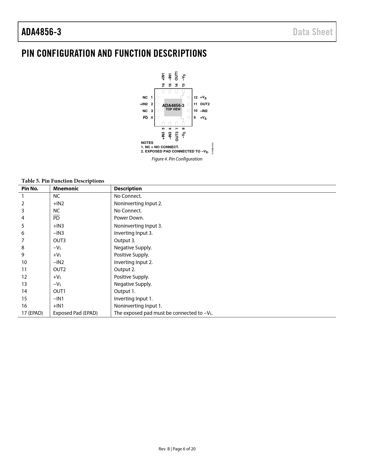 1 NC No Connect. 2 +IN2 Noninverting Input 2. 3 NC No Connect. 4 PD Power Down. 5 +IN3 Noninverting Input 3. 6 −IN3 Inverting Input 3. 7 OUT3 Output 3. 8 −VS Negative Supply. 9 +VS Positive Supply. 10 −IN2 Inverting Input 2. 11 OUT2 Output 2. 12 +VS Positive Supply. 13 −VS Negative Supply. 14 OUT1 Output 1. 15 −IN1 Inverting Input 1. 16 +IN1 Noninverting Input 1. 17 (EPAD) Exposed Pad (EPAD) The exposed pad must be connected to −VS. Rev. B | Page 6 of 20 Document Outline Features Applications Connection Diagram General Description Revision History Specifications 5 V Operation 3.3 V Operation Absolute Maximum Ratings Thermal Resistance Maximum Power Dissipation ESD Caution Pin Configuration and Function Descriptions Typical Performance Characteristics Theory of Operation Applications Information Using the ADA4856-3 in Gains Equal to +1, −1 Unity-Gain Operation Option 1 Option 2 Inverting Unity-Gain Operation Using the ADA4856-3 in Gains Equal to +3, +4, and +5 Gain of +3 Configuration Gain of +4 Configuration Gain of +5 Configuration 20 MHz Active Low-Pass Filter Video Line Driver Single-Supply Operation Power Down Layout Considerations Power Supply Bypassing Outline Dimensions Ordering Guide