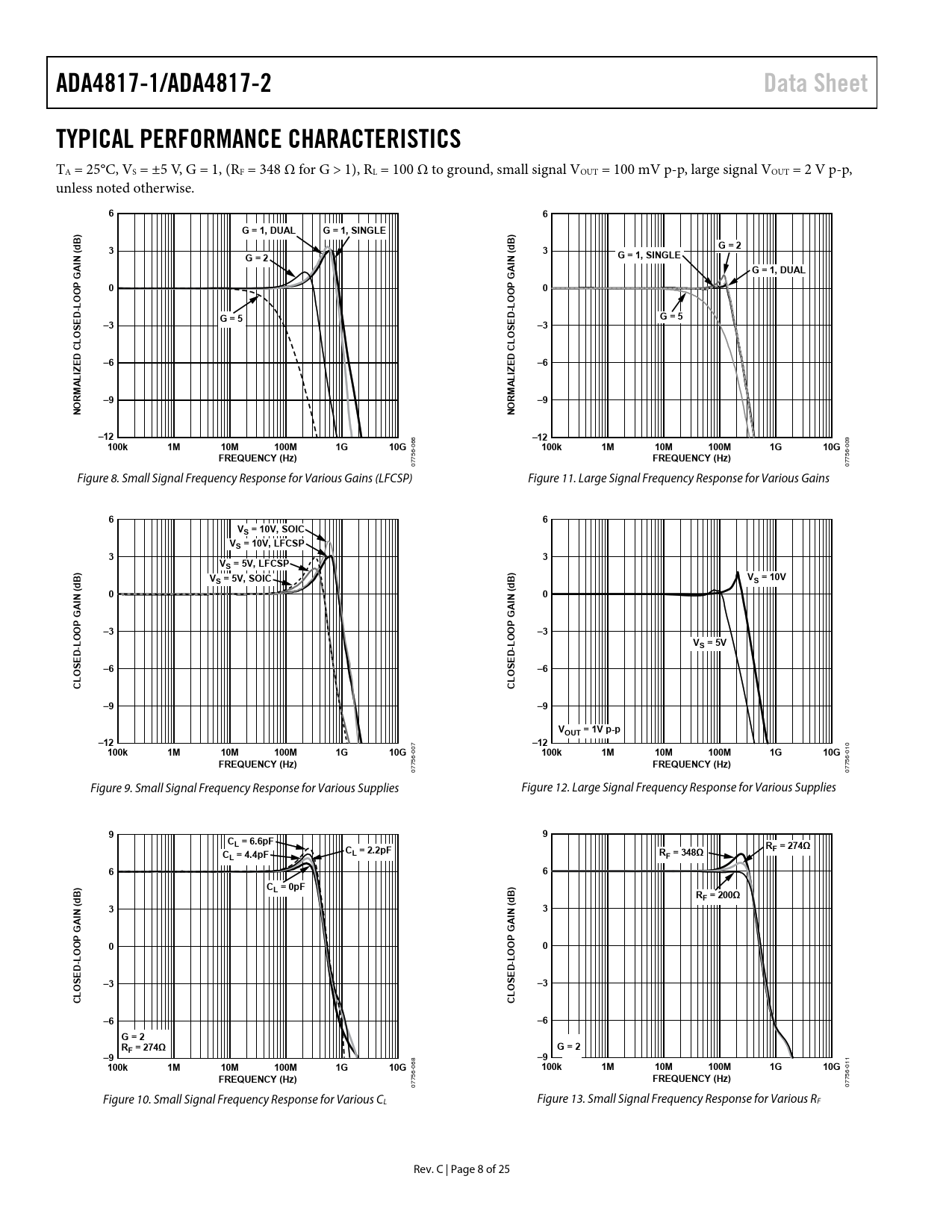 ADA4817-1/ADA4817-2Data SheetTYPICAL PERFORMANCE CHARACTERISTICS TA = 25°C, VS = ±5 V, G = 1, (RF = 348 Ω for G > 1), RL = 100 Ω to ground, small signal VOUT = 100 mV p-p, large signal VOUT = 2 V p-p, unless noted otherwise. 66G = 1, DUALG = 1, SINGLEB)B)ddG = 2(3(3NG = 2NG = 1, SINGLEAIAIG = 1, DUALGGPPO0O0OOLLD-D-EG = 5EG = 5S–3S–3OOCLCLDDE–6E–6IZIZALALRM–9RM–9NONO–12 6 –12 9 100k1M10M100M1G10G -06 100k1M10M100M1G10G -00 FREQUENCY (Hz) 56 FREQUENCY (Hz) 56 077 077 Figure 8. Small Signal Frequency Response for Various Gains (LFCSP) Figure 11. Large Signal Frequency Response for Various Gains 66VS = 10V, SOICVS = 10V, LFCSP33VS = 5V, LFCSP))BVBVdS = 5V, SOICdS = 10V(0(0ININGAGA–3–3OOPOOP-L-LVS = 5VDDEESSO–6O–6LLCC–9–9VOUT = 1V p-p–12 7 –12 0 100k1M10M100M1G10G 00 100k1M10M100M1G10G 01 6- 6- FREQUENCY (Hz) 75 FREQUENCY (Hz) 75 07 07 Figure 9. Small Signal Frequency Response for Various Supplies Figure 12. Large Signal Frequency Response for Various Supplies 99CL = 6.6pFCRF = 274ΩL = 2.2pFCRL = 4.4pFF = 348Ω66)C)BL = 0pFBddRF = 200Ω(3(3ININGAGA00OOPOOP-L-LDDEES–3O–3OSLLCC–6–6G = 2 RF = 274ΩG = 2–9 8 –9 1 100k1M10M100M1G10G 06 100k1M10M100M1G10G -01 6- FREQUENCY (Hz) 56 75 FREQUENCY (Hz) 07 077 Figure 10. Small Signal Frequency Response for Various CL Figure 13. Small Signal Frequency Response for Various RF Rev. C | Page 8 of 25 Document Outline FEATURES APPLICATIONS CONNECTION DIAGRAMS GENERAL DESCRIPTION TABLE OF CONTENTS REVISION HISTORY SPECIFICATIONS ±5 V OPERATION 5 V OPERATION ABSOLUTE MAXIMUM RATINGS THERMAL RESISTANCE MAXIMUM SAFE POWER DISSIPATION ESD CAUTION PIN CONFIGURATIONS AND FUNCTION DESCRIPTIONS TYPICAL PERFORMANCE CHARACTERISTICS TEST CIRCUITS THEORY OF OPERATION CLOSED-LOOP FREQUENCY RESPONSE NONINVERTING CLOSED-LOOP FREQUENCY RESPONSE INVERTING CLOSED-LOOP FREQUENCY RESPONSE WIDEBAND OPERATION DRIVING CAPACITIVE LOADS THERMAL CONSIDERATIONS POWER-DOWN OPERATION CAPACITIVE FEEDBACK HIGHER FREQUENCY ATTENUATION LAYOUT, GROUNDING, AND BYPASSING CONSIDERATIONS SIGNAL ROUTING POWER SUPPLY BYPASSING GROUNDING EXPOSED PADDLE LEAKAGE CURRENTS INPUT CAPACITANCE INPUT-TO-INPUT/OUTPUT COUPLING APPLICATIONS INFORMATION LOW DISTORTION PINOUT WIDEBAND PHOTODIODE PREAMP HIGH SPEED JFET INPUT INSTRUMENTATION AMPLIFIER ACTIVE LOW-PASS FILTER (LPF) OUTLINE DIMENSIONS ORDERING GUIDE