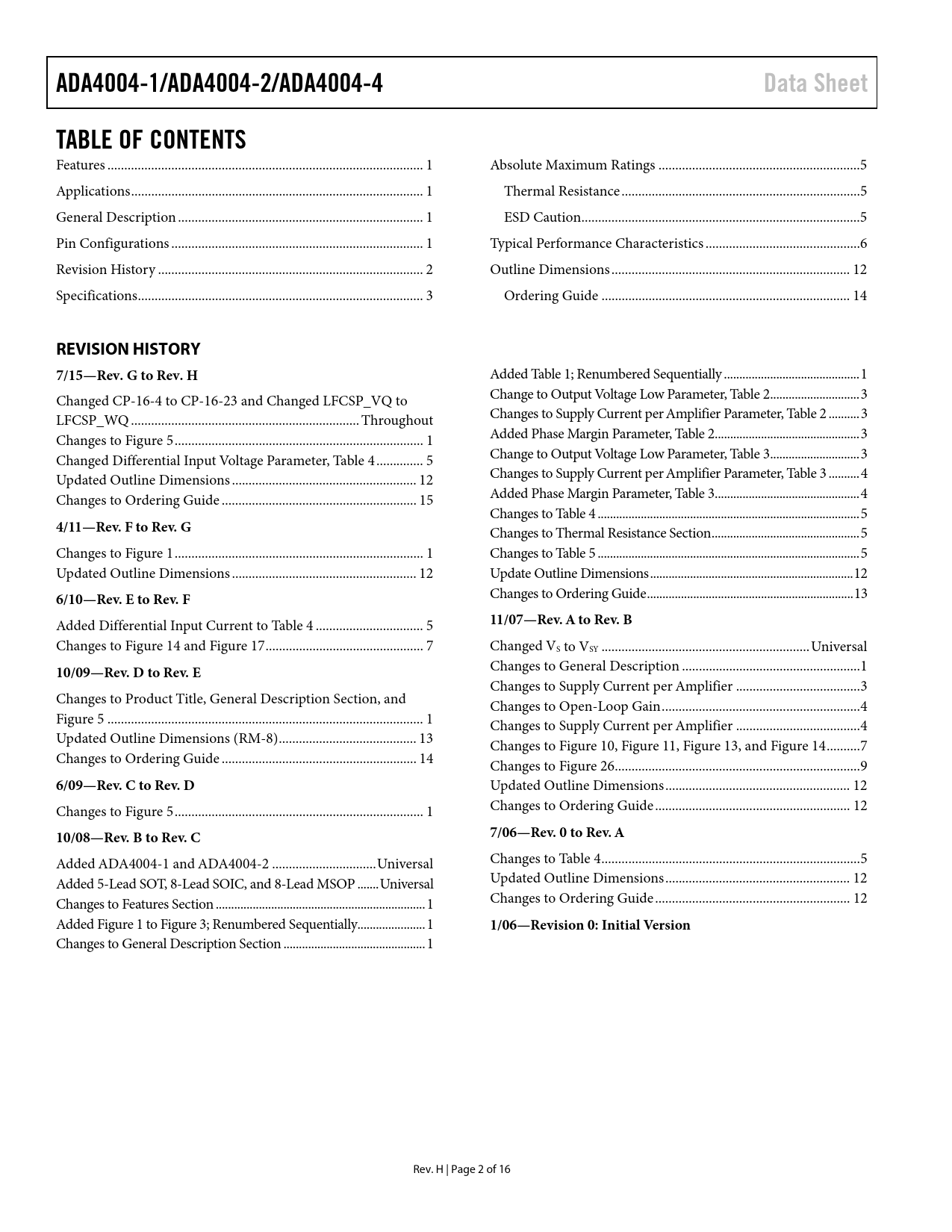 ADA4004-1/ADA4004-2/ADA4004-4 Data Sheet TABLE OF CONTENTS REVISION HISTORY 7/15—Rev G to Rev H 4/11—Rev F to Rev G