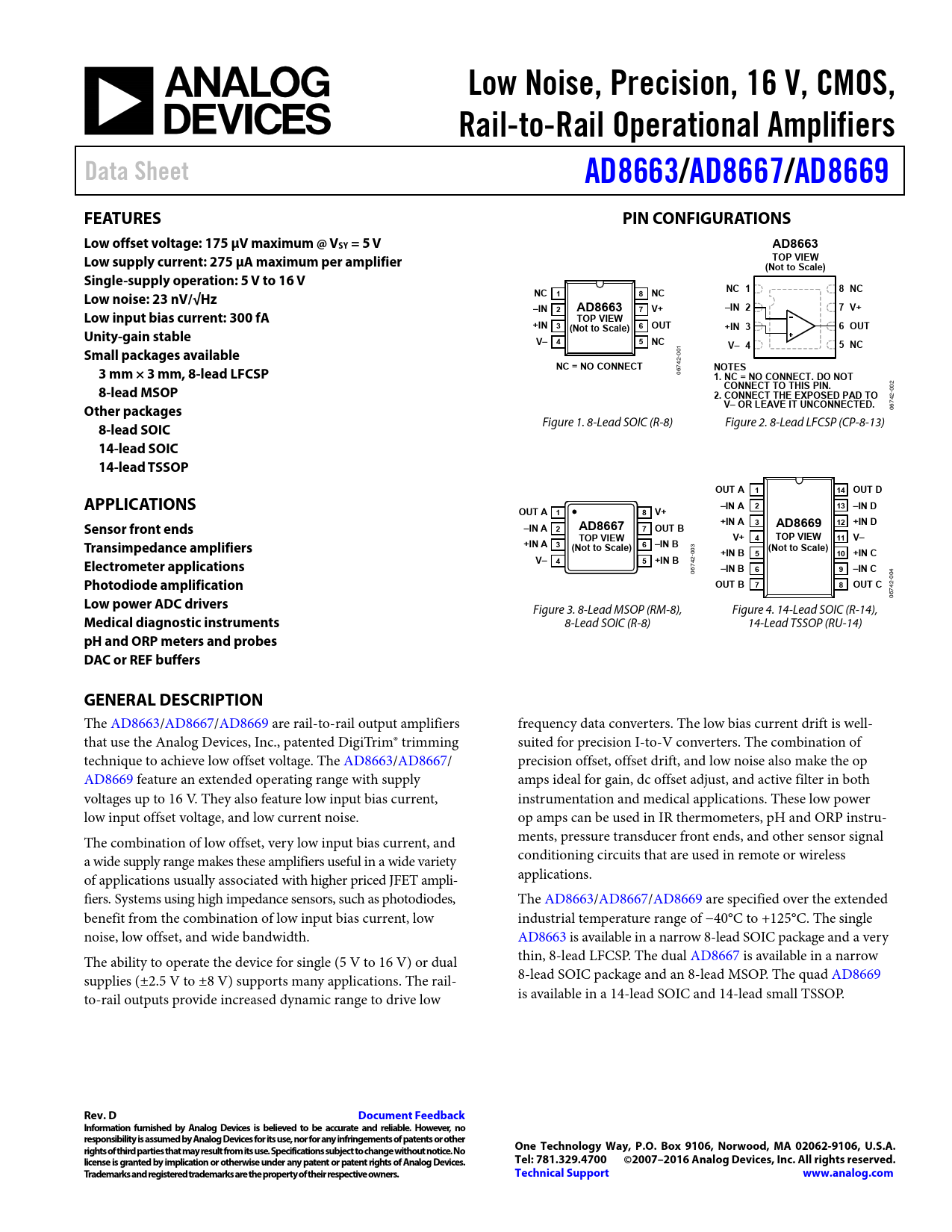 Low Noise, Precision, 16 V, CMOS,. Rail-to-Rail Operational Amplifiers. Data Sheet. AD8663/. AD8667/. AD8669. FEATURES