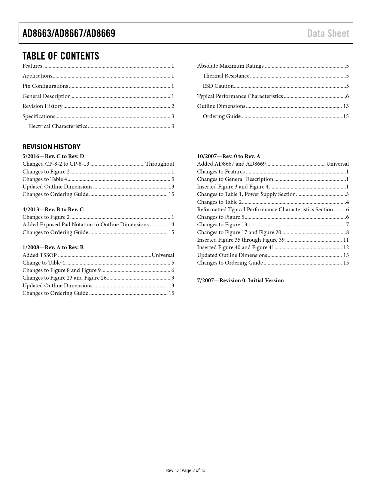 AD8663/AD8667/AD8669 Data Sheet TABLE OF CONTENTS REVISION HISTORY 5/2016—Rev C to Rev D 10/2007—Rev 0 to Rev A