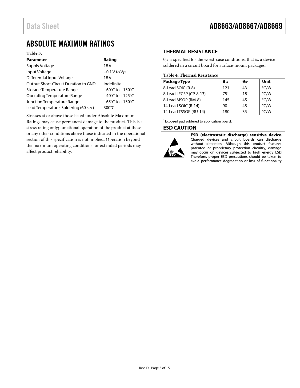 Data Sheet AD8663/AD8667/AD8669 ABSOLUTE MAXIMUM RATINGS Table 3 THERMAL RESISTANCE Parameter Rating