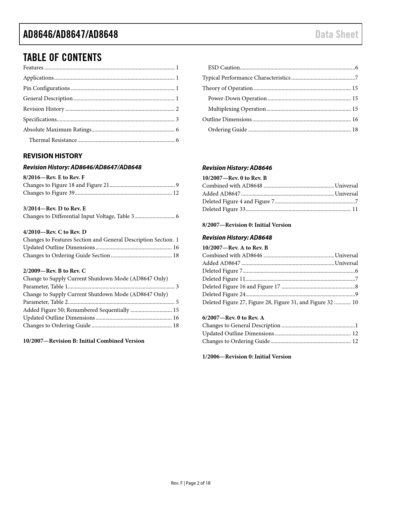 Páginas / Página18 / 2 — AD8646/AD8647/AD8648. Data Sheet. TABLE OF CONTENTS. REVISION HISTORY …