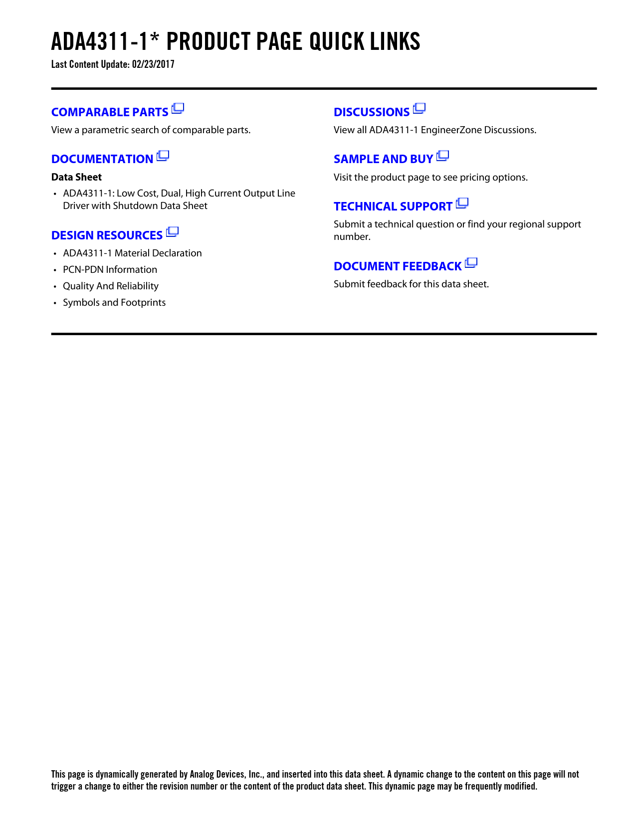 ADA4311-1* PRODUCT PAGE QUICK LINKS Last Content Update: 02/23/2017. COMPARABLE PARTS. DISCUSSIONS. DOCUMENTATION