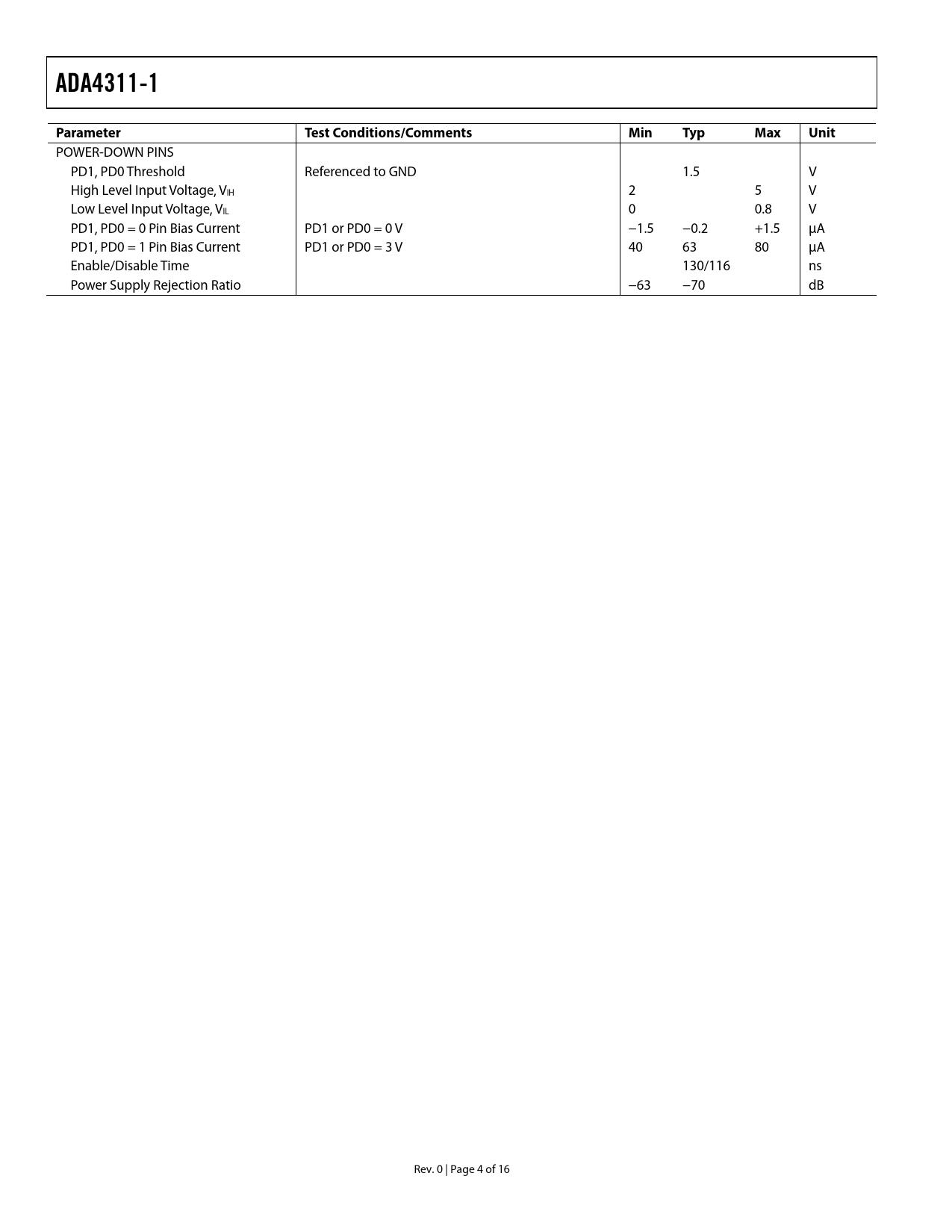 Páginas / Página17 / 5 — ADA4311-1. Parameter Test. Conditions/Comments. Min. Typ. Max. Unit