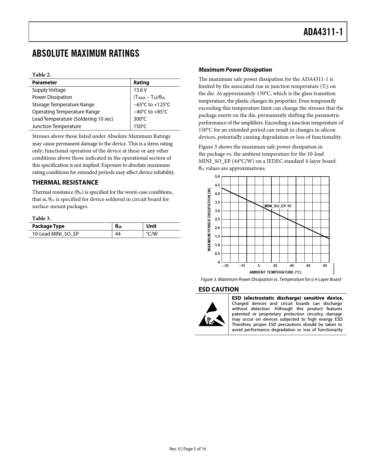 link to page 6 ADA4311-1ABSOLUTE MAXIMUM RATINGSMaximum Power DissipationTable 2. The maximum safe power dissipation for the ADA4311-1 is Parameter Rating limited by the associated rise in junction temperature (TJ) on Supply Voltage 13.6 V the die. At approximately 150°C, which is the glass transition Power Dissipation (TJMAX − TA)/θJA temperature, the plastic changes its properties. Even temporarily Storage Temperature Range −65°C to +125°C exceeding this temperature limit can change the stresses that the Operating Temperature Range −40°C to +85°C package exerts on the die, permanently shifting the parametric Lead Temperature (Soldering 10 sec) 300°C performance of the amplifiers. Exceeding a junction temperature of Junction Temperature 150°C 150°C for an extended period can result in changes in silicon Stresses above those listed under Absolute Maximum Ratings devices, potentially causing degradation or loss of functionality. may cause permanent damage to the device. This is a stress rating Figure 3 shows the maximum safe power dissipation in only; functional operation of the device at these or any other the package vs. the ambient temperature for the 10-lead conditions above those indicated in the operational section of MINI_SO_EP (44°C/W) on a JEDEC standard 4-layer board. this specification is not implied. Exposure to absolute maximum θJA values are approximations. rating conditions for extended periods may affect device reliability. 5.0THERMAL RESISTANCE4.5) Thermal resistance (θ W JA) is specified for the worst-case conditions, (4.0N that is, θJA is specified for device soldered in circuit board for IO3.5 surface-mount packages. ATMINI_SO_EP-10IP S3.0STable 3.R DI2.5EPackage TypeθJAUnitW O2.0 10-Lead MINI_SO_EP 44 °C/W P UM1.5IM X A1.0M0.50 –35–15525456585 3 00 0- AMBIENT TEMPERATURE (°C) 94 06 Figure 3. Maximum Power Dissipation vs. Temperature for a 4-Layer Board ESD CAUTION Rev. 0 | Page 5 of 16 Document Outline FEATURES APPLICATIONS PIN CONFIGURATION TYPICAL APPLICATION GENERAL DESCRIPTION TABLE OF CONTENTS REVISION HISTORY SPECIFICATIONS ABSOLUTE MAXIMUM RATINGS THERMAL RESISTANCE Maximum Power Dissipation ESD CAUTION PIN CONFIGURATION AND FUNCTION DESCRIPTIONS TYPICAL PERFORMANCE CHARACTERISTICS THEORY OF OPERATION APPLICATION INFORMATION FEEDBACK RESISTOR SELECTION POWER CONTROL MODES OF OPERATION EXPOSED THERMAL PAD CONNECTIONS POWERLINE APPLICATION BOARD LAYOUT POWER SUPPLY BYPASSING OUTLINE DIMENSIONS ORDERING GUIDE