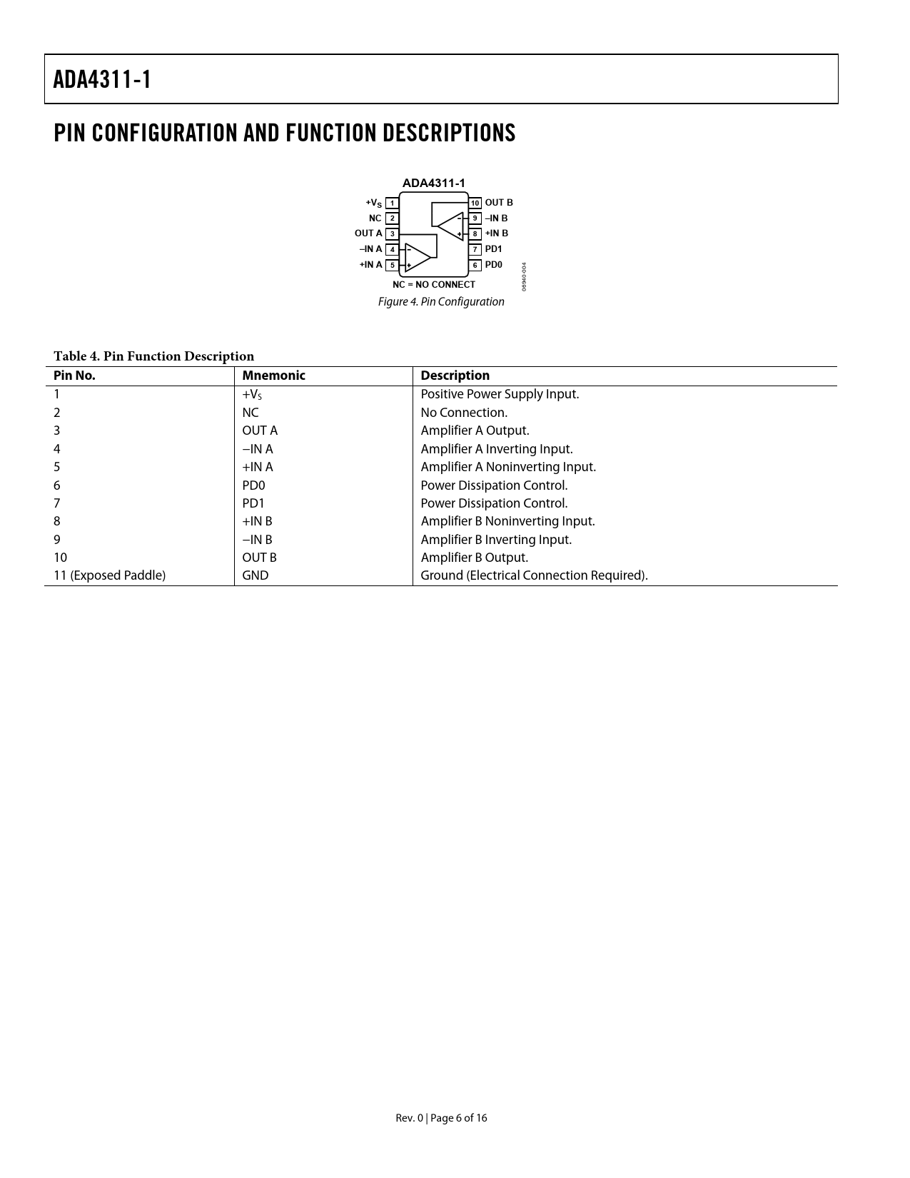 ADA4311-1. PIN CONFIGURATION AND FUNCTION DESCRIPTIONS. +VS 1. 10 OUT B. NC 2. 9 –IN B. OUT A 3. 8 +IN B. –IN A 4. 7 PD1. +IN A 5. 6 PD0