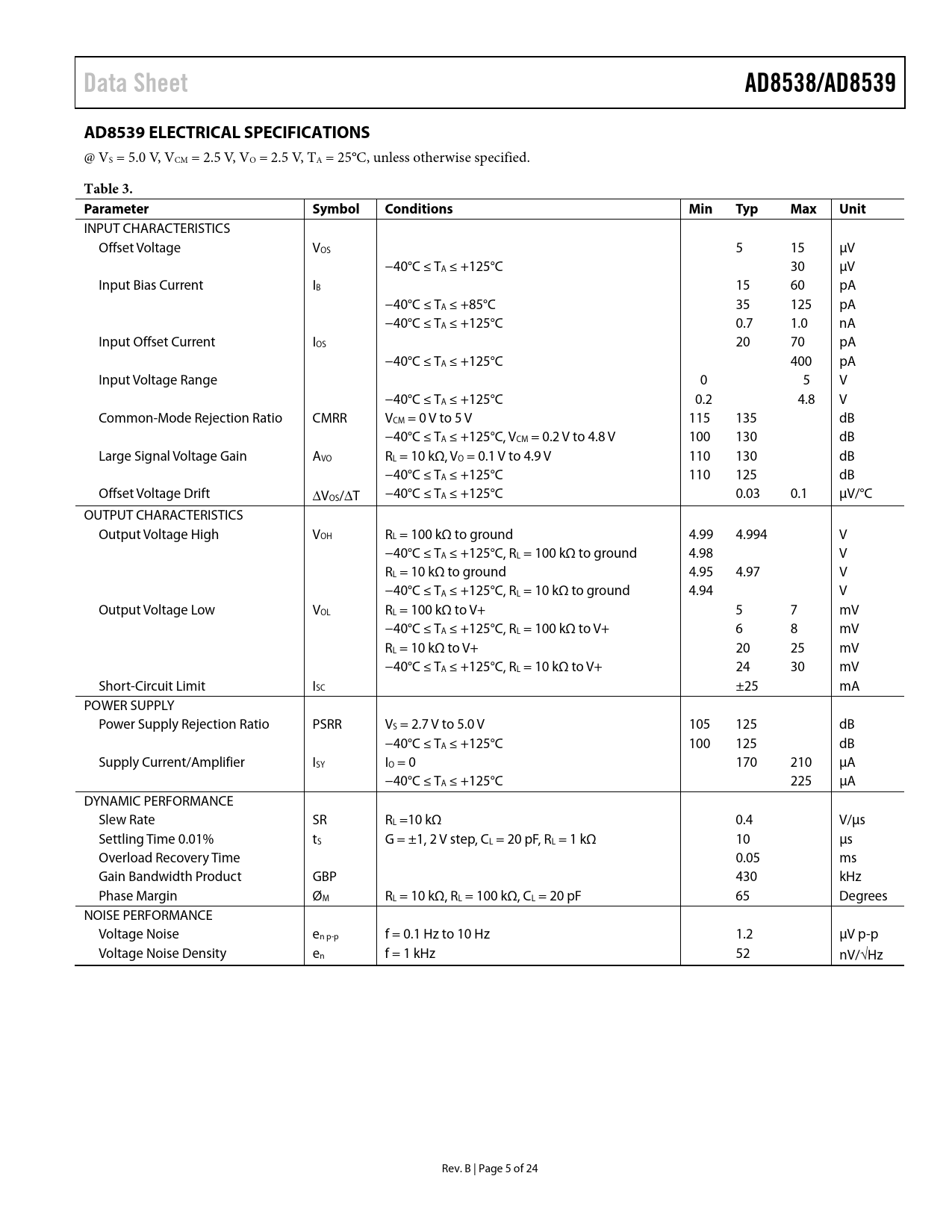 Data Sheet. AD8538/AD8539. AD8539 ELECTRICAL SPECIFICATIONS. Table 3. Parameter. Symbol. Conditions. Min. Typ. Max. Unit