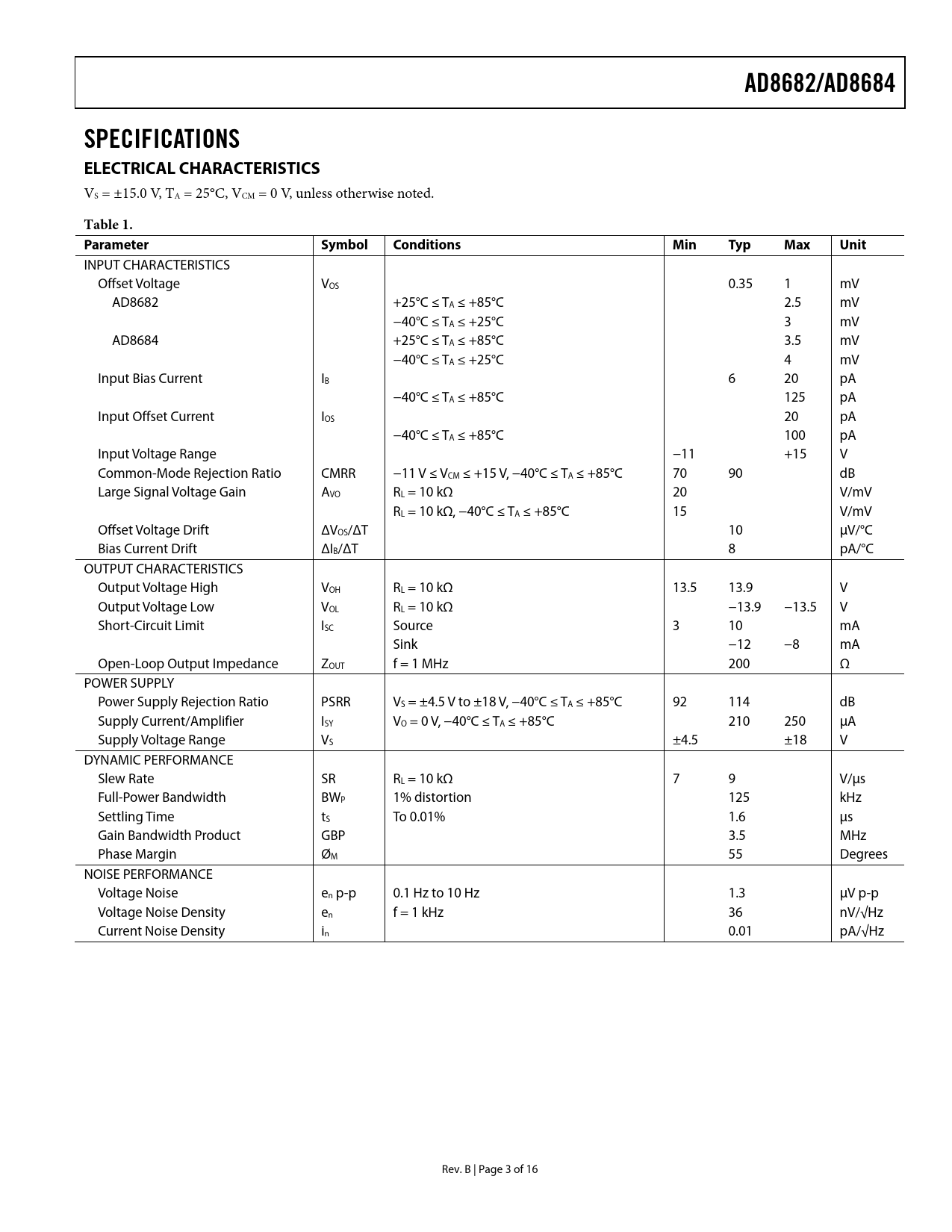 AD8682/AD8684SPECIFICATIONS ELECTRICAL CHARACTERISTICS VS = ±15.0 V, TA = 25°C, VCM = 0 V, unless otherwise noted. Table 1. Parameter SymbolConditionsMinTypMaxUnit INPUT CHARACTERISTICS Offset Voltage VOS 0.35 1 mV AD8682 +25°C ≤ TA ≤ +85°C 2.5 mV −40°C ≤ TA ≤ +25°C 3 mV AD8684 +25°C ≤ TA ≤ +85°C 3.5 mV −40°C ≤ TA ≤ +25°C 4 mV Input Bias Current IB 6 20 pA −40°C ≤ TA ≤ +85°C 125 pA Input Offset Current IOS 20 pA −40°C ≤ TA ≤ +85°C 100 pA Input Voltage Range −11 +15 V Common-Mode Rejection Ratio CMRR −11 V ≤ VCM ≤ +15 V, −40°C ≤ TA ≤ +85°C 70 90 dB Large Signal Voltage Gain AVO RL = 10 kΩ 20 V/mV RL = 10 kΩ, −40°C ≤ TA ≤ +85°C 15 V/mV Offset Voltage Drift ΔVOS/ΔT 10 μV/°C Bias Current Drift ΔIB/ΔT 8 pA/°C OUTPUT CHARACTERISTICS Output Voltage High VOH RL = 10 kΩ 13.5 13.9 V Output Voltage Low VOL RL = 10 kΩ −13.9 −13.5 V Short-Circuit Limit ISC Source 3 10 mA Sink −12 −8 mA Open-Loop Output Impedance ZOUT f = 1 MHz 200 Ω POWER SUPPLY Power Supply Rejection Ratio PSRR VS = ±4.5 V to ±18 V, −40°C ≤ TA ≤ +85°C 92 114 dB Supply Current/Amplifier ISY VO = 0 V, −40°C ≤ TA ≤ +85°C 210 250 μA Supply Voltage Range VS ±4.5 ±18 V DYNAMIC PERFORMANCE Slew Rate SR RL = 10 kΩ 7 9 V/μs Full-Power Bandwidth BWP 1% distortion 125 kHz Settling Time tS To 0.01% 1.6 μs Gain Bandwidth Product GBP 3.5 MHz Phase Margin ØM 55 Degrees NOISE PERFORMANCE Voltage Noise en p-p 0.1 Hz to 10 Hz 1.3 μV p-p Voltage Noise Density en f = 1 kHz 36 nV/√Hz Current Noise Density in 0.01 pA/√Hz Rev. B | Page 3 of 16 Document Outline FEATURES APPLICATIONS GENERAL DESCRIPTION TABLE OF CONTENTS REVISION HISTORY SPECIFICATIONS ELECTRICAL CHARACTERISTICS ABSOLUTE MAXIMUM RATINGS THERMAL RESISTANCE ESD CAUTION TYPICAL PERFORMANCE CHARACTERISTICS APPLICATIONS INFORMATION HIGH-SIDE SIGNAL CONDITIONING PHASE INVERSION ACTIVE FILTERS PROGRAMMABLE STATE VARIABLE FILTER OUTLINE DIMENSIONS ORDERING GUIDE