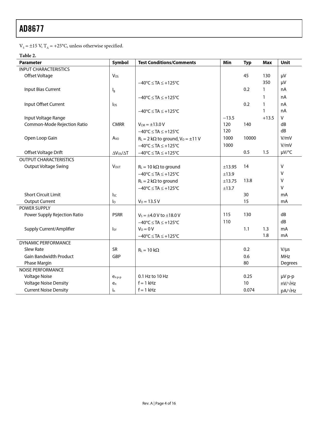 AD8677 V = ±15 V, T = +25°C, unless otherwise specified. S A Table 2. Parameter SymbolTestConditions/CommentsMinTypMaxUnit INPUT CHARACTERISTICS Offset Voltage VOS 45 130 μV −40°C ≤ TA ≤ +125°C 350 μV Input Bias Current I 0.2 1 nA B −40°C ≤ TA ≤ +125°C 1 nA Input Offset Current IOS 0.2 1 nA −40°C ≤ TA ≤ +125°C 1 nA Input Voltage Range −13.5 +13.5 V Common-Mode Rejection Ratio CMRR VCM = ±13.0 V 120 140 dB −40°C ≤ TA ≤ +125°C 120 dB Open Loop Gain AVO RL = 2 kΩ to ground, VO = ±11 V 1000 10000 V/mV −40°C ≤ TA ≤ +125°C 1000 V/mV Offset Voltage Drift ΔVOS/ΔT −40°C ≤ TA ≤ +125°C 0.5 1.5 μV/°C OUTPUT CHARACTERISTICS Output Voltage Swing VOUT RL = 10 kΩ to ground ±13.95 14 V −40°C ≤ TA ≤ +125°C ±13.9 V RL = 2 kΩ to ground ±13.75 13.8 V −40°C ≤ TA ≤ +125°C ±13.7 V Short Circuit Limit ISC 30 mA Output Current IO VO = 13.5 V 15 mA POWER SUPPLY Power Supply Rejection Ratio PSRR VS = ±4.0 V to ±18.0 V 115 130 dB −40°C ≤ TA ≤ +125°C 110 dB Supply Current/Amplifier ISY VO = 0 V 1.1 1.3 mA −40°C ≤ TA ≤ +125°C 1.8 mA DYNAMIC PERFORMANCE Slew Rate SR RL = 10 kΩ 0.2 V/μs Gain Bandwidth Product GBP 0.6 MHz Phase Margin 80 Degrees NOISE PERFORMANCE Voltage Noise en p-p 0.1 Hz to 10 Hz 0.25 μV p-p Voltage Noise Density en f = 1 kHz 10 nV/√Hz Current Noise Density in f = 1 kHz 0.074 pA/√Hz Rev. A | Page 4 of 16 Document Outline FEATURES APPLICATIONS GENERAL DESCRIPTION PIN CONFIGURATIONS TABLE OF CONTENTS REVISION HISTORY SPECIFICATIONS ABSOLUTE MAXIMUM RATINGS THERMAL RESISTANCE ESD CAUTION TYPICAL PERFORMANCE CHARACTERISTICS OUTLINE DIMENSIONS ORDERING GUIDE