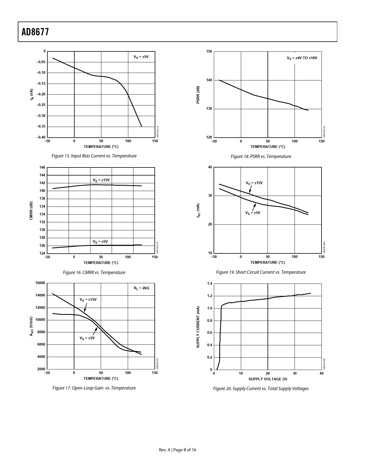AD8677. 150. VS = ±5V. VS = ±4V TO ±18V. –0.05. –0.10. 140. –0.15. B) d. –0.20. (nA I B. RR ( S P. –0.25. 130. –0.30. –0.35. –0.40. 120. –50. 100