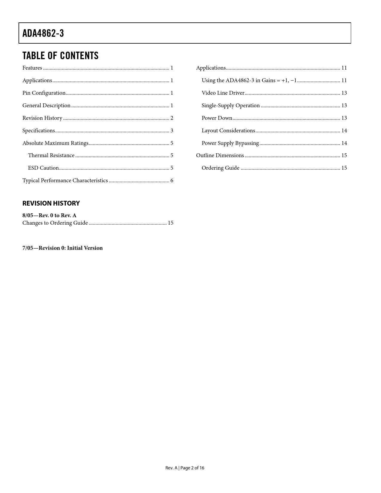 ADA4862-3. TABLE OF CONTENTS. REVISION HISTORY. 8/05—Rev. 0 to Rev. A. 7/05—Revision 0: Initial Version