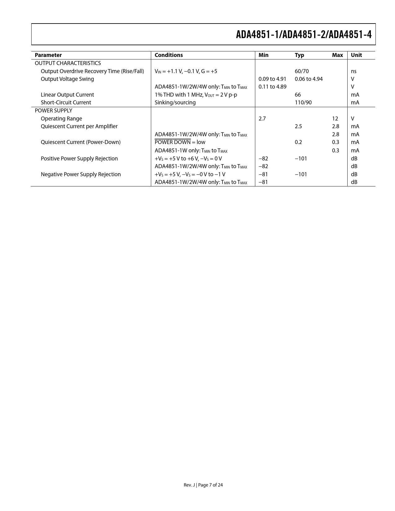 Páginas / Página24 / 7 — ADA4851-1/ADA4851-2/ADA4851-4. Parameter Conditions. Min. Typ. Max. Unit