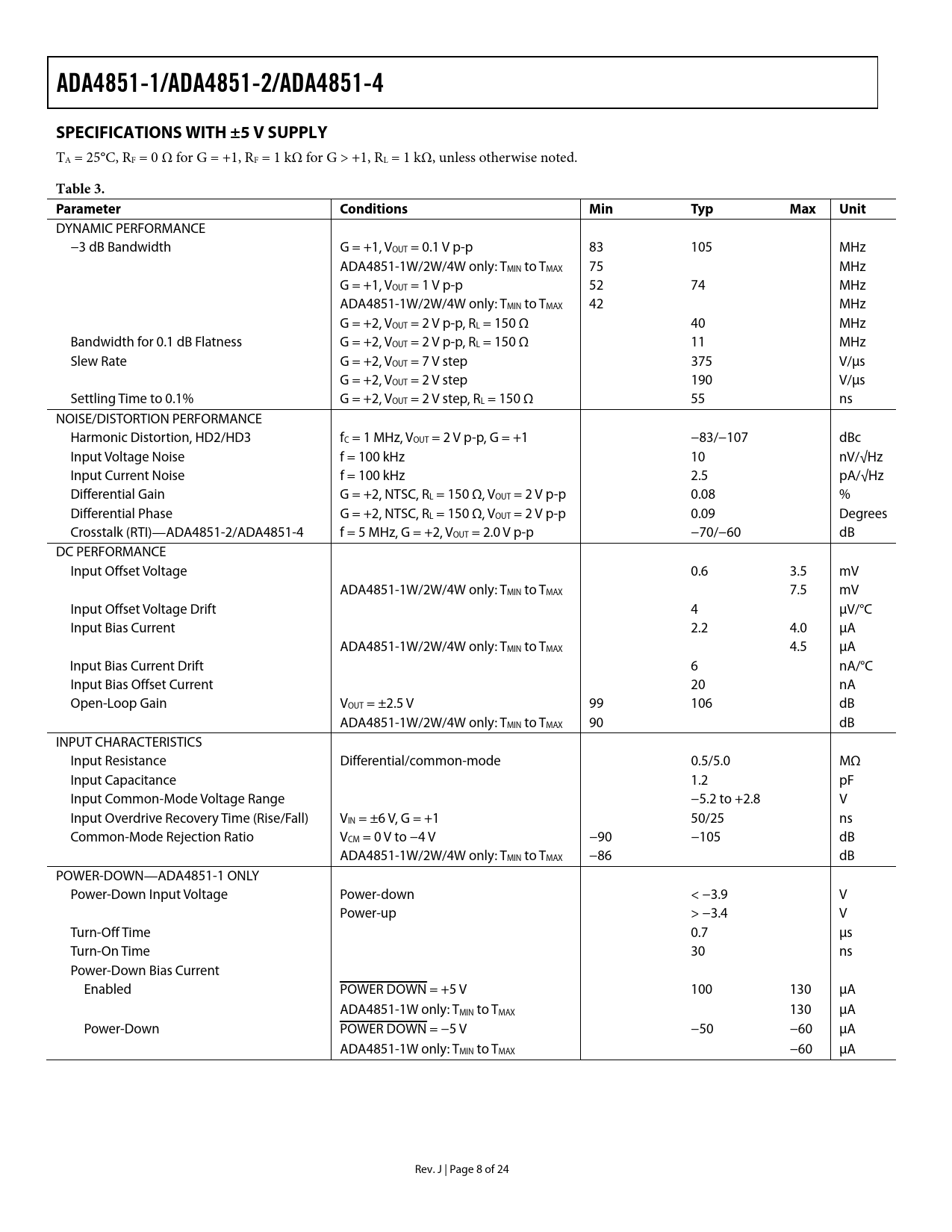 ADA4851-1/ADA4851-2/ADA4851-4SPECIFICATIONS WITH ±5 V SUPPLY TA = 25°C, RF = 0 Ω for G = +1, RF = 1 kΩ for G > +1, RL = 1 kΩ, unless otherwise noted. Table 3. Parameter ConditionsMinTypMaxUnit DYNAMIC PERFORMANCE −3 dB Bandwidth G = +1, VOUT = 0.1 V p-p 83 105 MHz ADA4851-1W/2W/4W only: TMIN to TMAX 75 MHz G = +1, VOUT = 1 V p-p 52 74 MHz ADA4851-1W/2W/4W only: TMIN to TMAX 42 MHz G = +2, VOUT = 2 V p-p, RL = 150 Ω 40 MHz Bandwidth for 0.1 dB Flatness G = +2, VOUT = 2 V p-p, RL = 150 Ω 11 MHz Slew Rate G = +2, VOUT = 7 V step 375 V/μs G = +2, VOUT = 2 V step 190 V/μs Settling Time to 0.1% G = +2, VOUT = 2 V step, RL = 150 Ω 55 ns NOISE/DISTORTION PERFORMANCE Harmonic Distortion, HD2/HD3 fC = 1 MHz, VOUT = 2 V p-p, G = +1 −83/−107 dBc Input Voltage Noise f = 100 kHz 10 nV/√Hz Input Current Noise f = 100 kHz 2.5 pA/√Hz Differential Gain G = +2, NTSC, RL = 150 Ω, VOUT = 2 V p-p 0.08 % Differential Phase G = +2, NTSC, RL = 150 Ω, VOUT = 2 V p-p 0.09 Degrees Crosstalk (RTI)—ADA4851-2/ADA4851-4 f = 5 MHz, G = +2, VOUT = 2.0 V p-p −70/−60 dB DC PERFORMANCE Input Offset Voltage 0.6 3.5 mV ADA4851-1W/2W/4W only: TMIN to TMAX 7.5 mV Input Offset Voltage Drift 4 μV/°C Input Bias Current 2.2 4.0 μA ADA4851-1W/2W/4W only: TMIN to TMAX 4.5 μA Input Bias Current Drift 6 nA/°C Input Bias Offset Current 20 nA Open-Loop Gain VOUT = ±2.5 V 99 106 dB ADA4851-1W/2W/4W only: TMIN to TMAX 90 dB INPUT CHARACTERISTICS Input Resistance Differential/common-mode 0.5/5.0 MΩ Input Capacitance 1.2 pF Input Common-Mode Voltage Range −5.2 to +2.8 V Input Overdrive Recovery Time (Rise/Fall) VIN = ±6 V, G = +1 50/25 ns Common-Mode Rejection Ratio VCM = 0 V to −4 V −90 −105 dB ADA4851-1W/2W/4W only: TMIN to TMAX −86 dB POWER-DOWN—ADA4851-1 ONLY Power-Down Input Voltage Power-down < −3.9 V Power-up > −3.4 V Turn-Off Time 0.7 μs Turn-On Time 30 ns Power-Down Bias Current Enabled POWER DOWN = +5 V 100 130 μA ADA4851-1W only: TMIN to TMAX 130 μA Power-Down POWER DOWN = −5 V −50 −60 μA ADA4851-1W only: TMIN to TMAX −60 μA Rev. J | Page 8 of 24 Document Outline FEATURES APPLICATIONS PIN CONFIGURATIONS GENERAL DESCRIPTION TABLE OF CONTENTS REVISION HISTORY SPECIFICATIONS SPECIFICATIONS WITH +3 V SUPPLY SPECIFICATIONS WITH +5 V SUPPLY SPECIFICATIONS WITH ±5 V SUPPLY ABSOLUTE MAXIMUM RATINGS THERMAL RESISTANCE Maximum Power Dissipation ESD CAUTION TYPICAL PERFORMANCE CHARACTERISTICS CIRCUIT DESCRIPTION HEADROOM CONSIDERATIONS OVERLOAD BEHAVIOR AND RECOVERY Input Output SINGLE-SUPPLY VIDEO AMPLIFIER VIDEO RECONSTRUCTION FILTER OUTLINE DIMENSIONS ORDERING GUIDE AUTOMOTIVE PRODUCTS