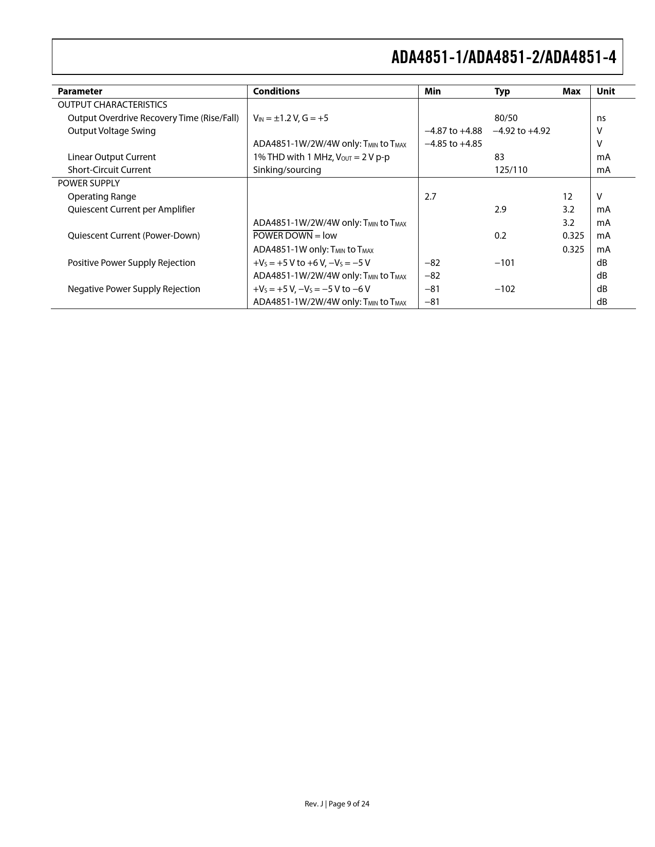 ADA4851-1/ADA4851-2/ADA4851-4Parameter ConditionsMinTypMaxUnit OUTPUT CHARACTERISTICS Output Overdrive Recovery Time (Rise/Fall) VIN = ±1.2 V, G = +5 80/50 ns Output Voltage Swing −4.87 to +4.88 −4.92 to +4.92 V ADA4851-1W/2W/4W only: TMIN to TMAX −4.85 to +4.85 V Linear Output Current 1% THD with 1 MHz, VOUT = 2 V p-p 83 mA Short-Circuit Current Sinking/sourcing 125/110 mA POWER SUPPLY Operating Range 2.7 12 V Quiescent Current per Amplifier 2.9 3.2 mA ADA4851-1W/2W/4W only: TMIN to TMAX 3.2 mA Quiescent Current (Power-Down) POWER DOWN = low 0.2 0.325 mA ADA4851-1W only: TMIN to TMAX 0.325 mA Positive Power Supply Rejection +VS = +5 V to +6 V, −VS = −5 V −82 −101 dB ADA4851-1W/2W/4W only: TMIN to TMAX −82 dB Negative Power Supply Rejection +VS = +5 V, −VS = −5 V to −6 V −81 −102 dB ADA4851-1W/2W/4W only: TMIN to TMAX −81 dB Rev. J | Page 9 of 24 Document Outline FEATURES APPLICATIONS PIN CONFIGURATIONS GENERAL DESCRIPTION TABLE OF CONTENTS REVISION HISTORY SPECIFICATIONS SPECIFICATIONS WITH +3 V SUPPLY SPECIFICATIONS WITH +5 V SUPPLY SPECIFICATIONS WITH ±5 V SUPPLY ABSOLUTE MAXIMUM RATINGS THERMAL RESISTANCE Maximum Power Dissipation ESD CAUTION TYPICAL PERFORMANCE CHARACTERISTICS CIRCUIT DESCRIPTION HEADROOM CONSIDERATIONS OVERLOAD BEHAVIOR AND RECOVERY Input Output SINGLE-SUPPLY VIDEO AMPLIFIER VIDEO RECONSTRUCTION FILTER OUTLINE DIMENSIONS ORDERING GUIDE AUTOMOTIVE PRODUCTS
