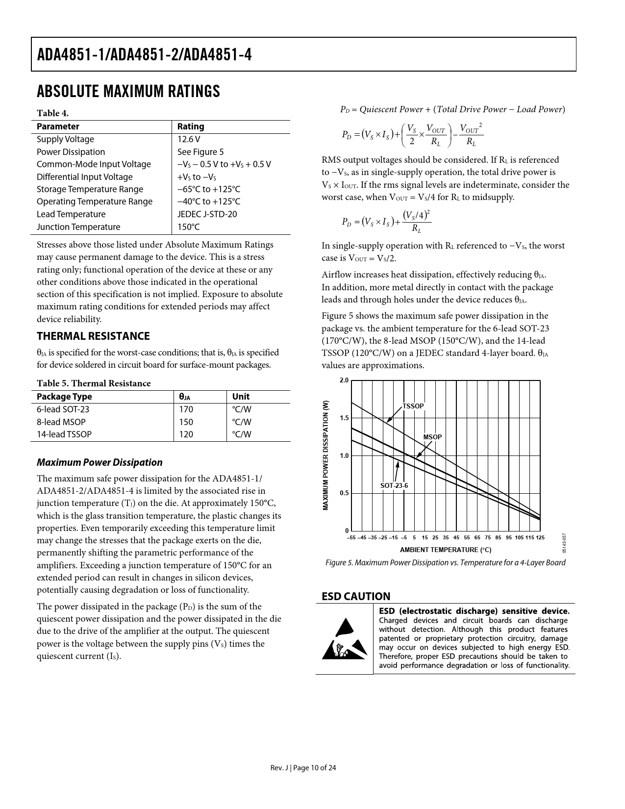 link to page 10 link to page 10 ADA4851-1/ADA4851-2/ADA4851-4ABSOLUTE MAXIMUM RATINGS PD = Quiescent Power + (Total Drive Power − Load Power) Table 4. Parameter Rating ⎛ V V ⎞ V 2 = × + ⎜ × ⎟ D P ( – S V IS ) S OUT OUT Supply Voltage 12.6 V ⎝ 2 RL ⎠ RL Power Dissipation See Figure 5 RMS output voltages should be considered. If R Common-Mode Input Voltage −V L is referenced S − 0.5 V to +VS + 0.5 V to −V Differential Input Voltage +V S, as in single-supply operation, the total drive power is S to −VS V Storage Temperature Range −65°C to +125°C S × IOUT. If the rms signal levels are indeterminate, consider the worst case, when V Operating Temperature Range −40°C to +125°C OUT = VS/4 for RL to midsupply. Lead Temperature JEDEC J-STD-20 V 2 /4 = × + D P ( S V IS ) ( S ) Junction Temperature 150°C RL Stresses above those listed under Absolute Maximum Ratings In single-supply operation with RL referenced to −VS, the worst may cause permanent damage to the device. This is a stress case is VOUT = VS/2. rating only; functional operation of the device at these or any Airflow increases heat dissipation, effectively reducing θJA. other conditions above those indicated in the operational In addition, more metal directly in contact with the package section of this specification is not implied. Exposure to absolute leads and through holes under the device reduces θJA. maximum rating conditions for extended periods may affect device reliability. Figure 5 shows the maximum safe power dissipation in the package vs. the ambient temperature for the 6-lead SOT-23 THERMAL RESISTANCE (170°C/W), the 8-lead MSOP (150°C/W), and the 14-lead θJA is specified for the worst-case conditions; that is, θJA is specified TSSOP (120°C/W) on a JEDEC standard 4-layer board. θJA for device soldered in circuit board for surface-mount packages. values are approximations. 2.0Table 5. Thermal Resistance Package TypeθJA Unit)TSSOP 6-lead SOT-23 170 °C/W (W N1.5IO 8-lead MSOP 150 °C/W PAT 14-lead TSSOP 120 °C/W MSOPSSIR DI1.0EMaximum Power DissipationW The maximum safe power dissipation for the ADA4851-1/ SOT-23-6 ADA4851-2/ADA4851-4 is limited by the associated rise in MUM PO0.5 junction temperature (TJ) on the die. At approximately 150°C, MAXI which is the glass transition temperature, the plastic changes its properties. Even temporarily exceeding this temperature limit 0–55 –45 –35 –25 –15 –5515 25 35 45 55 65 75 85 95 105 115 125 may change the stresses that the package exerts on the die, AMBIENT TEMPERATURE ( ° C) 05143-057 permanently shifting the parametric performance of the amplifiers. Exceeding a junction temperature of 150°C for an Figure 5. Maximum Power Dissipation vs. Temperature for a 4-Layer Board extended period can result in changes in silicon devices, potentially causing degradation or loss of functionality. ESD CAUTION The power dissipated in the package (PD) is the sum of the quiescent power dissipation and the power dissipated in the die due to the drive of the amplifier at the output. The quiescent power is the voltage between the supply pins (VS) times the quiescent current (IS). Rev. J | Page 10 of 24 Document Outline FEATURES APPLICATIONS PIN CONFIGURATIONS GENERAL DESCRIPTION TABLE OF CONTENTS REVISION HISTORY SPECIFICATIONS SPECIFICATIONS WITH +3 V SUPPLY SPECIFICATIONS WITH +5 V SUPPLY SPECIFICATIONS WITH ±5 V SUPPLY ABSOLUTE MAXIMUM RATINGS THERMAL RESISTANCE Maximum Power Dissipation ESD CAUTION TYPICAL PERFORMANCE CHARACTERISTICS CIRCUIT DESCRIPTION HEADROOM CONSIDERATIONS OVERLOAD BEHAVIOR AND RECOVERY Input Output SINGLE-SUPPLY VIDEO AMPLIFIER VIDEO RECONSTRUCTION FILTER OUTLINE DIMENSIONS ORDERING GUIDE AUTOMOTIVE PRODUCTS