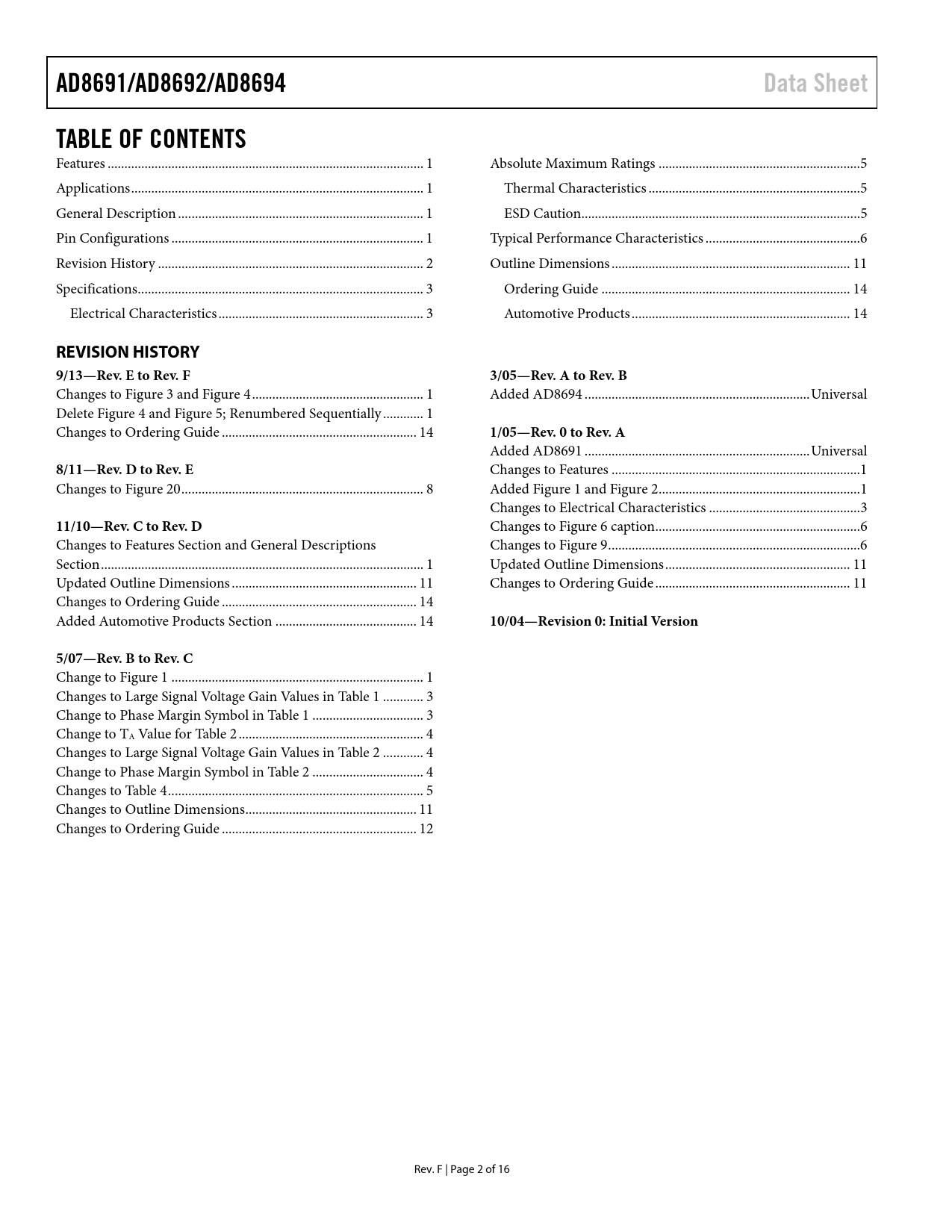 link to page 1 link to page 1 link to page 1 link to page 1 link to page 2 link to page 3 link to page 3 link to page 5 link to page 5 link to page 5 link to page 6 link to page 11 link to page 14 link to page 14 AD8691/AD8692/AD8694Data SheetTABLE OF CONTENTS Features .. 1 Absolute Maximum Ratings ..5 Applications ... 1 Thermal Characteristics ...5 General Description ... 1 ESD Caution...5 Pin Configurations ... 1 Typical Performance Characteristics ..6 Revision History ... 2 Outline Dimensions ... 11 Specifications ... 3 Ordering Guide .. 14 Electrical Characteristics ... 3 Automotive Products ... 14 REVISION HISTORY 9/13—Rev. E to Rev. F3/05—Rev. A to Rev. B Changes to Figure 3 and Figure 4 ... 1 Added AD8694 ... Universal Delete Figure 4 and Figure 5; Renumbered Sequentially .. 1 Changes to Ordering Guide .. 14 1/05—Rev. 0 to Rev. A Added AD8691 ... Universal 8/11—Rev. D to Rev. E Changes to Features .. 1 Changes to Figure 20 .. 8 Added Figure 1 and Figure 2 .. 1 Changes to Electrical Characteristics ... 3 11/10—Rev. C to Rev. D Changes to Figure 6 caption ... 6 Changes to Features Section and General Descriptions Changes to Figure 9 ... 6 Section .. 1 Updated Outline Dimensions ... 11 Updated Outline Dimensions ... 11 Changes to Ordering Guide .. 11 Changes to Ordering Guide .. 14 Added Automotive Products Section .. 14 10/04—Revision 0: Initial Version5/07—Rev. B to Rev. C Change to Figure 1 ... 1 Changes to Large Signal Voltage Gain Values in Table 1 .. 3 Change to Phase Margin Symbol in Table 1 ... 3 Change to TA Value for Table 2 ... 4 Changes to Large Signal Voltage Gain Values in Table 2 .. 4 Change to Phase Margin Symbol in Table 2 ... 4 Changes to Table 4 .. 5 Changes to Outline Dimensions ... 11 Changes to Ordering Guide .. 12 Rev. F | Page 2 of 16 Document Outline Features Applications General Description Pin Configurations Table of Contents Revision History Specifications Electrical Characteristics Absolute Maximum Ratings Thermal Characteristics ESD Caution Typical Performance Characteristics Outline Dimensions Ordering Guide Automotive Products
