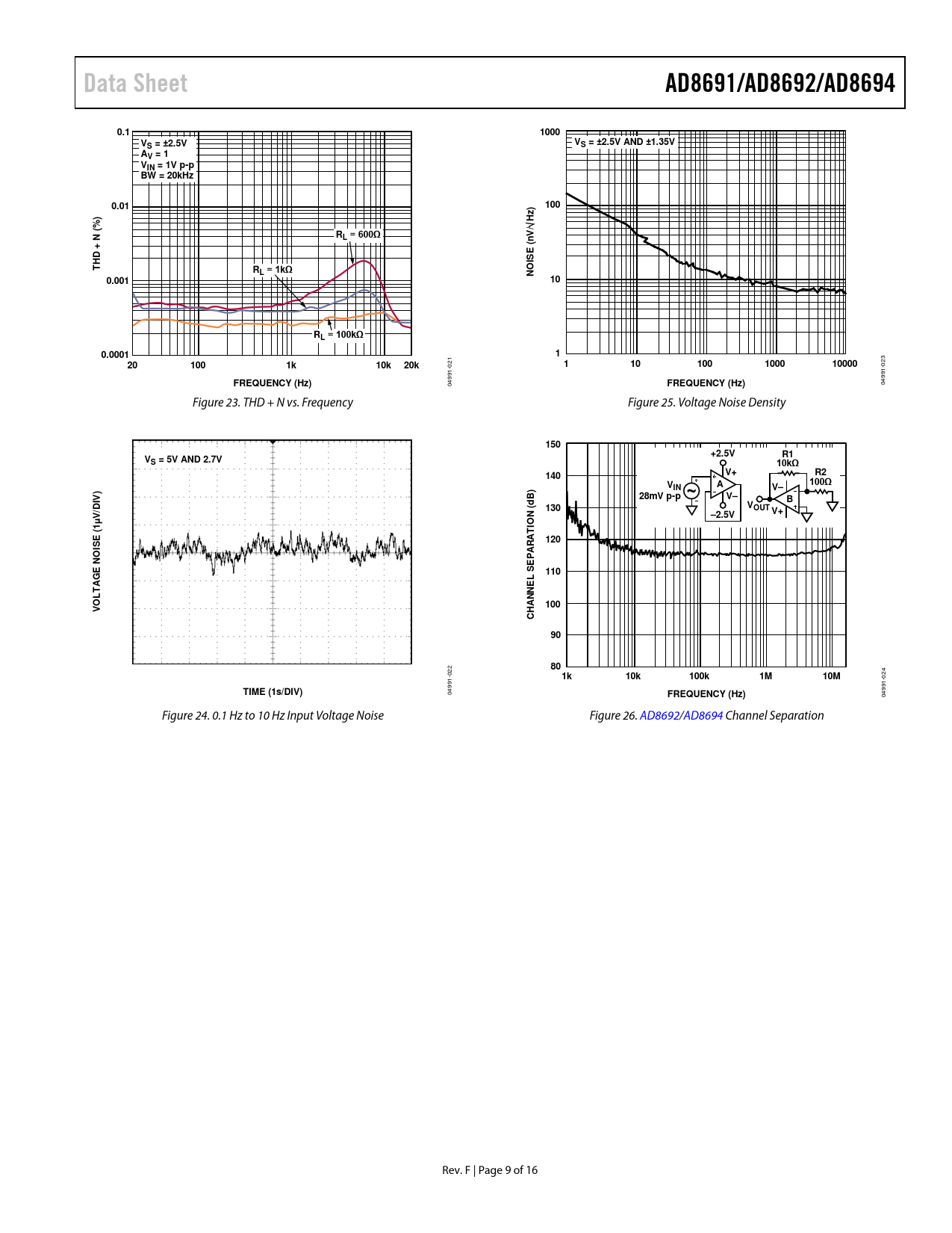 Data Sheet. AD8691/AD8692/AD8694. 0.1. 1000. S = ±2.5V. S = ±2.5V AND ±1.35V. AV = 1 VIN = 1V p-p BW = 20kHz. 0.01. 100. N (. L = 600Ω. HD +