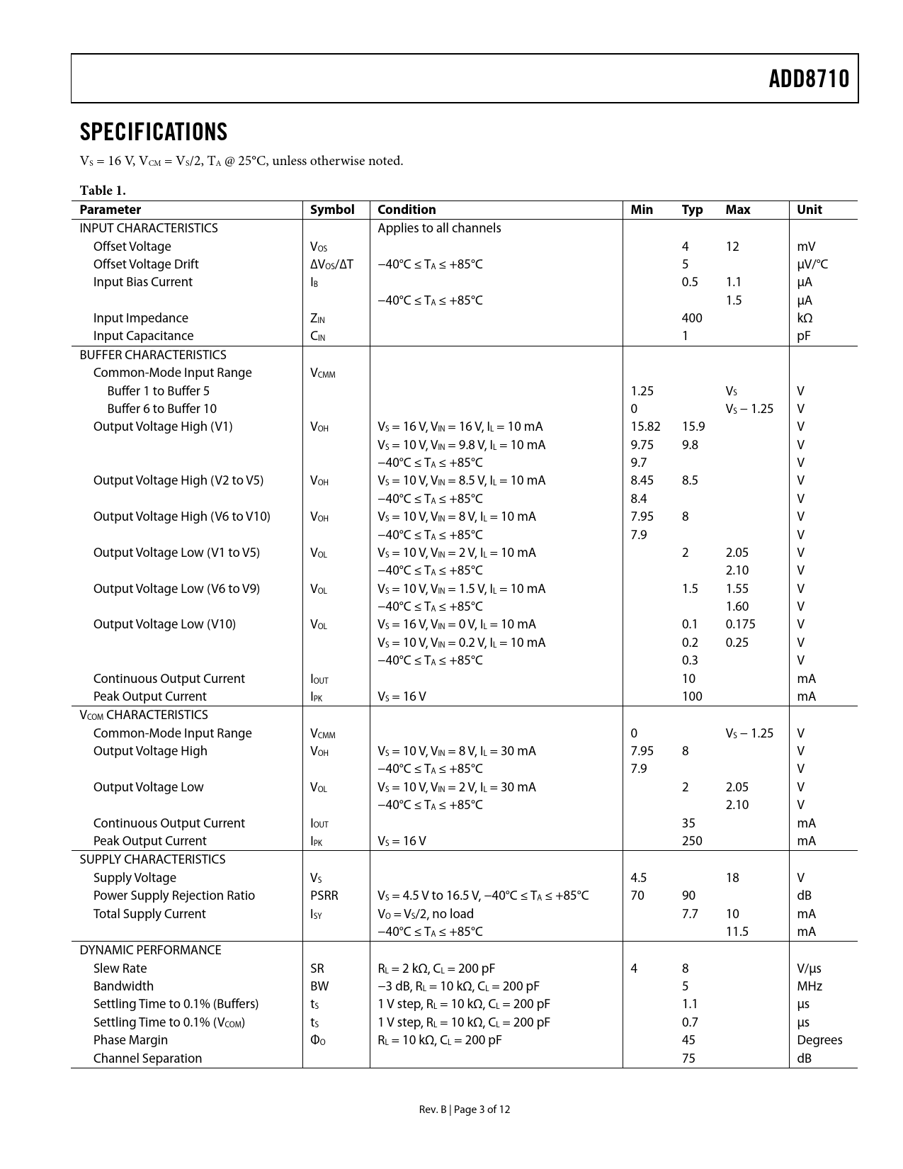 ADD8710SPECIFICATIONS VS = 16 V, VCM = VS/2, TA @ 25°C, unless otherwise noted. Table 1. ParameterSymbolConditionMinTypMaxUnit INPUT CHARACTERISTICS Applies to all channels Offset Voltage VOS 4 12 mV Offset Voltage Drift ∆VOS/∆T −40°C ≤ TA ≤ +85°C 5 μV/°C Input Bias Current IB 0.5 1.1 μA −40°C ≤ TA ≤ +85°C 1.5 μA Input Impedance ZIN 400 kΩ Input Capacitance CIN 1 pF BUFFER CHARACTERISTICS Common-Mode Input Range VCMM Buffer 1 to Buffer 5 1.25 VS V Buffer 6 to Buffer 10 0 VS − 1.25 V Output Voltage High (V1) VOH VS = 16 V, VIN = 16 V, IL = 10 mA 15.82 15.9 V VS = 10 V, VIN = 9.8 V, IL = 10 mA 9.75 9.8 V −40°C ≤ TA ≤ +85°C 9.7 V Output Voltage High (V2 to V5) VOH VS = 10 V, VIN = 8.5 V, IL = 10 mA 8.45 8.5 V −40°C ≤ TA ≤ +85°C 8.4 V Output Voltage High (V6 to V10) VOH VS = 10 V, VIN = 8 V, IL = 10 mA 7.95 8 V −40°C ≤ TA ≤ +85°C 7.9 V Output Voltage Low (V1 to V5) VOL VS = 10 V, VIN = 2 V, IL = 10 mA 2 2.05 V −40°C ≤ TA ≤ +85°C 2.10 V Output Voltage Low (V6 to V9) VOL VS = 10 V, VIN = 1.5 V, IL = 10 mA 1.5 1.55 V −40°C ≤ TA ≤ +85°C 1.60 V Output Voltage Low (V10) VOL VS = 16 V, VIN = 0 V, IL = 10 mA 0.1 0.175 V VS = 10 V, VIN = 0.2 V, IL = 10 mA 0.2 0.25 V −40°C ≤ TA ≤ +85°C 0.3 V Continuous Output Current IOUT 10 mA Peak Output Current IPK VS = 16 V 100 mA VCOM CHARACTERISTICS Common-Mode Input Range VCMM 0 VS − 1.25 V Output Voltage High VOH VS = 10 V, VIN = 8 V, IL = 30 mA 7.95 8 V −40°C ≤ TA ≤ +85°C 7.9 V Output Voltage Low VOL VS = 10 V, VIN = 2 V, IL = 30 mA 2 2.05 V −40°C ≤ TA ≤ +85°C 2.10 V Continuous Output Current IOUT 35 mA Peak Output Current IPK VS = 16 V 250 mA SUPPLY CHARACTERISTICS Supply Voltage VS 4.5 18 V Power Supply Rejection Ratio PSRR VS = 4.5 V to 16.5 V, −40°C ≤ TA ≤ +85°C 70 90 dB Total Supply Current ISY VO = VS/2, no load 7.7 10 mA −40°C ≤ TA ≤ +85°C 11.5 mA DYNAMIC PERFORMANCE Slew Rate SR RL = 2 kΩ, CL = 200 pF 4 8 V/μs Bandwidth BW −3 dB, RL = 10 kΩ, CL = 200 pF 5 MHz Settling Time to 0.1% (Buffers) tS 1 V step, RL = 10 kΩ, CL = 200 pF 1.1 μs Settling Time to 0.1% (VCOM) tS 1 V step, RL = 10 kΩ, CL = 200 pF 0.7 μs Phase Margin ΦO RL = 10 kΩ, CL = 200 pF 45 Degrees Channel Separation 75 dB Rev. B | Page 3 of 12 Document Outline FEATURES APPLICATIONS GENERAL DESCRIPTION PIN CONFIGURATION FUNCTIONAL BLOCK DIAGRAM TABLE OF CONTENTS REVISION HISTORY SPECIFICATIONS ABSOLUTE MAXIMUM RATINGS THERMAL RESISTANCE ESD CAUTION TYPICAL PERFORMANCE CHARACTERISTICS OUTLINE DIMENSIONS ORDERING GUIDE
