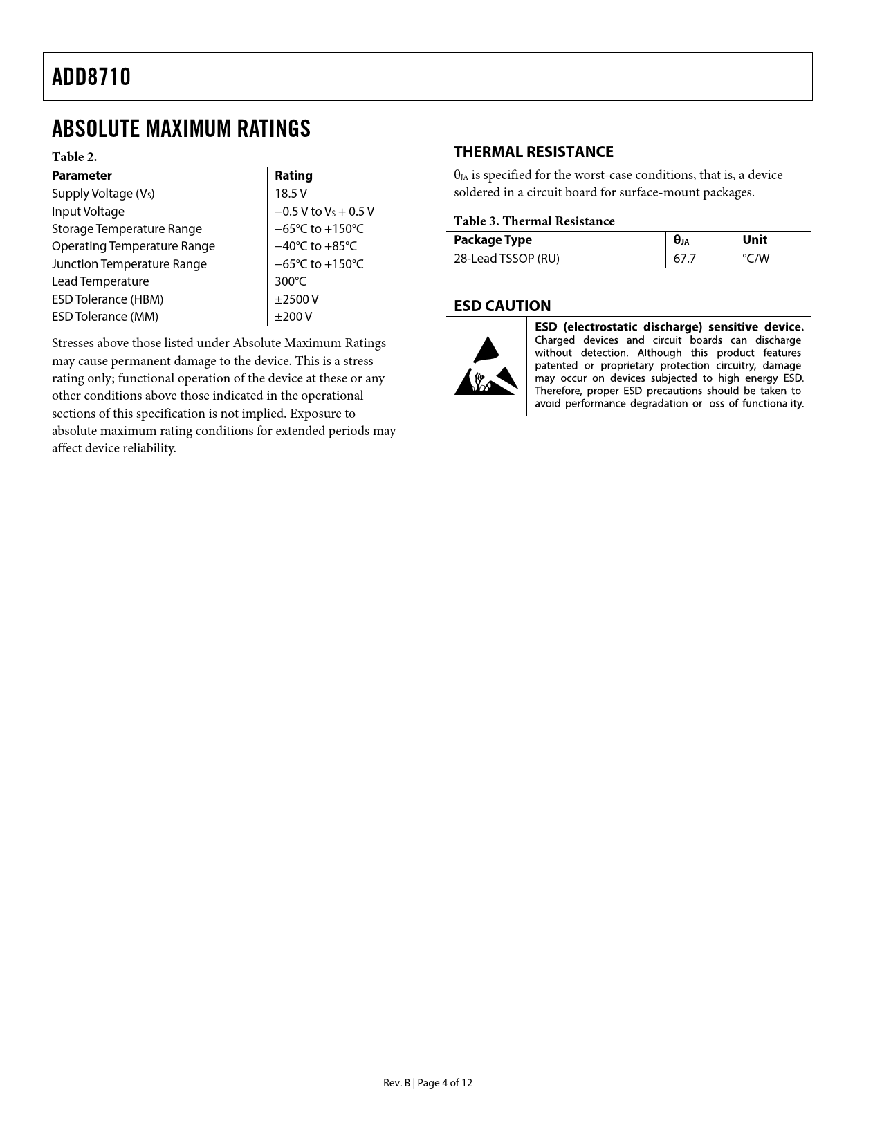 ADD8710ABSOLUTE MAXIMUM RATINGS Table 2.THERMAL RESISTANCEParameterRating θJA is specified for the worst-case conditions, that is, a device Supply Voltage (VS) 18.5 V soldered in a circuit board for surface-mount packages. Input Voltage −0.5 V to VS + 0.5 V Table 3. Thermal Resistance Storage Temperature Range −65°C to +150°C Package Typeθ Operating Temperature Range −40°C to +85°C JA Unit Junction Temperature Range −65°C to +150°C 28-Lead TSSOP (RU) 67.7 °C/W Lead Temperature 300°C ESD Tolerance (HBM) ±2500 V ESD CAUTION ESD Tolerance (MM) ±200 V Stresses above those listed under Absolute Maximum Ratings may cause permanent damage to the device. This is a stress rating only; functional operation of the device at these or any other conditions above those indicated in the operational sections of this specification is not implied. Exposure to absolute maximum rating conditions for extended periods may affect device reliability. Rev. B | Page 4 of 12 Document Outline FEATURES APPLICATIONS GENERAL DESCRIPTION PIN CONFIGURATION FUNCTIONAL BLOCK DIAGRAM TABLE OF CONTENTS REVISION HISTORY SPECIFICATIONS ABSOLUTE MAXIMUM RATINGS THERMAL RESISTANCE ESD CAUTION TYPICAL PERFORMANCE CHARACTERISTICS OUTLINE DIMENSIONS ORDERING GUIDE