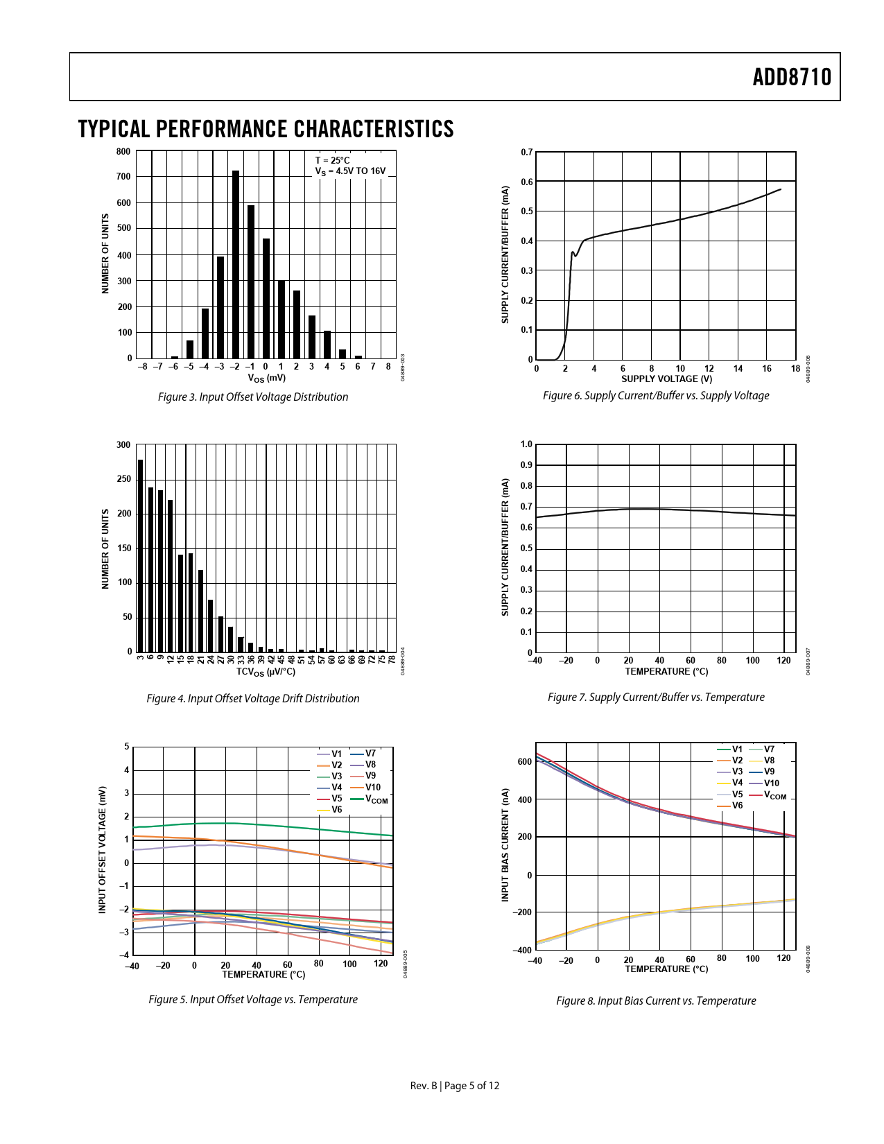 Línea de modelo para esta hoja de datos Versión de texto del documento ADD8710 TYPICAL PERFORMANCE CHARACTERISTICS 800 0.7 T = 25°C V 700 S = 4.5V TO 16V 0.6 A) 600 m S R ( 0.5 T E F 500 UNI F /BUF 0.4 400 NT R O BE 0.3 300 NUM CURRE LY 0.2 200 P P U S 100 0.1 0 0 –8 –7 –6 –5 –4 –3 –2 –1 0 1 2 3 4 5 6 7 8 003 006 9-0 2 4 6 8 10 12 14 16 18 89-VOS (mV) 488 0SUPPLY VOLTAGE (V) 48 0 Figure 3. Input Offset Voltage Distribution Figure 6. Supply Current/Buffer vs. Supply Voltage300 1.0 0.9 250 A) 0.8 m R ( S 0.7 200 E T F 0.6 UNI F /BUF 150 NT 0.5 R O BE 0.4 100 CURRE NUM LY 0.3 P P U 0.2 50 S 0.1 0 3 0 0046 9 00712 15 18 21 24 27 30 33 36 39 4 42 45 48 51 5 57 60 63 66 69 72 75 9-78 –40 –20 0 20 40 60 80 100 120 89-TCVOS (µV/°C) 488 48 0TEMPERATURE (°C) 0 Figure 4. Input Offset Voltage Drift Distribution Figure 7. Supply Current/Buffer vs. Temperature5 V1 V7 V1 V7 V8 600 V2 V8 4 V2 V3 V3 V9 V9 V10 V4 V10 V) V4 3 A) V5 V m V5 VCOM n 400 COM ( V6 E ( V6 G 2 NT LTA O 1 RRE 200 T V CU E S 0 IA FFS B 0 UT T O –1 U P INP IN –2 –200 –3 8–400 05–4 -00 0120 –40 –20 0 20 40 60 80 100 9-120 –40 –20 0 20 40 60 80 100 TEMPERATURE (°C) 889TEMPERATURE (°C) 88 04 04 Figure 5. Input Offset Voltage vs. Temperature Figure 8. Input Bias Current vs. Temperature Rev. B | Page 5 of 12 Document Outline FEATURES APPLICATIONS GENERAL DESCRIPTION PIN CONFIGURATION FUNCTIONAL BLOCK DIAGRAM TABLE OF CONTENTS REVISION HISTORY SPECIFICATIONS ABSOLUTE MAXIMUM RATINGS THERMAL RESISTANCE ESD CAUTION TYPICAL PERFORMANCE CHARACTERISTICS OUTLINE DIMENSIONS ORDERING GUIDE