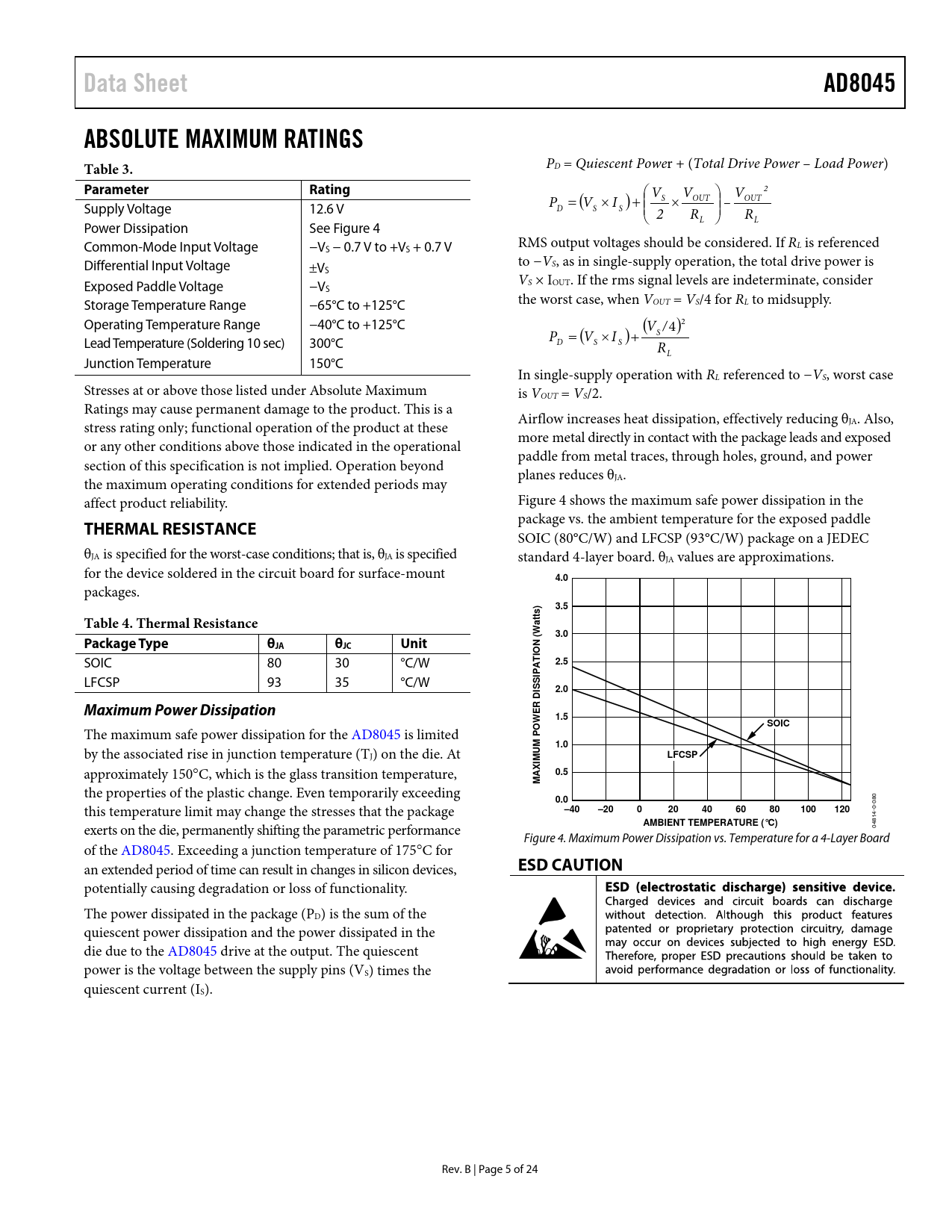 Data Sheet AD8045 ABSOLUTE MAXIMUM RATINGS Table 3 Parameter Rating THERMAL RESISTANCE 4.0 3.5 Table 4 Thermal Resistance 3.0