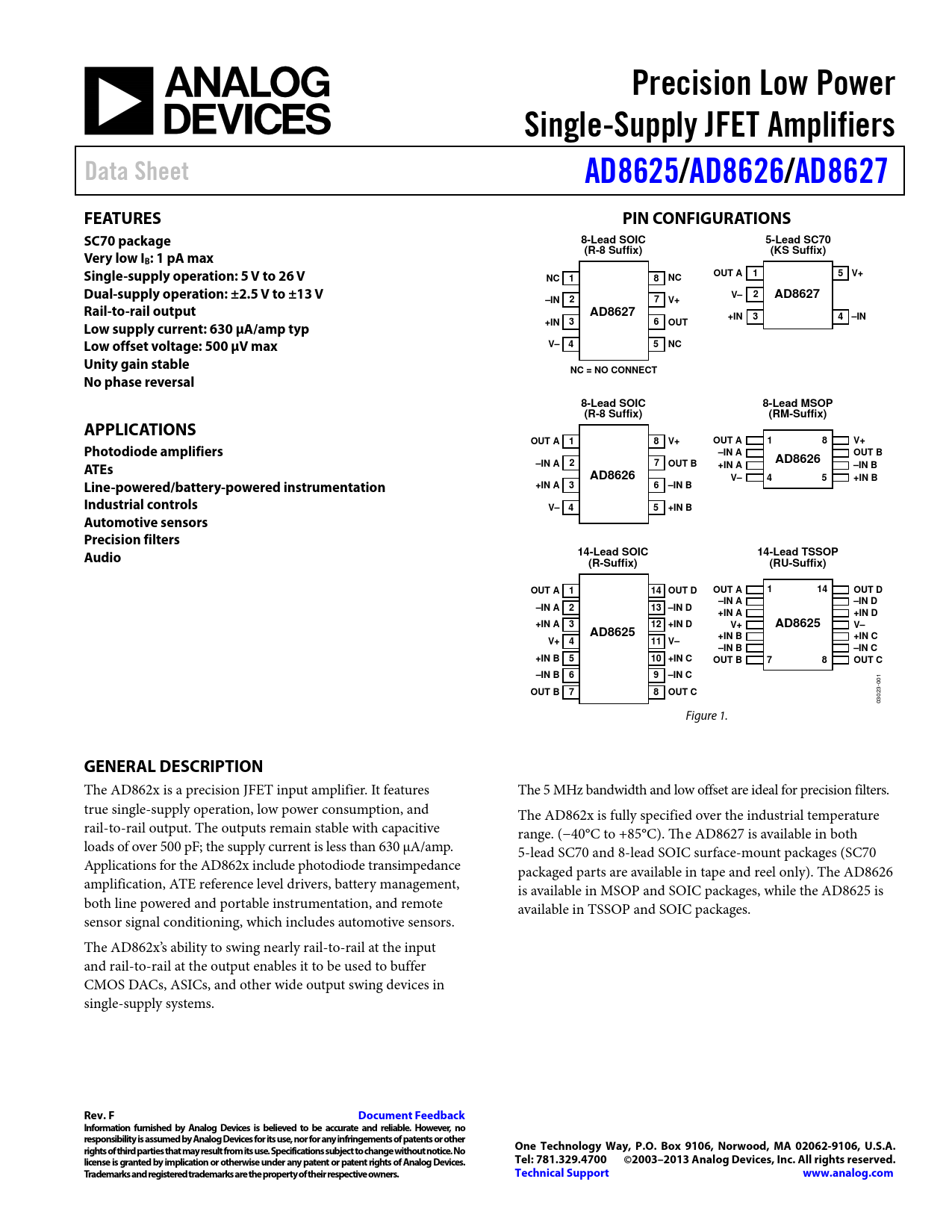 Precision Low Power. Single-Supply JFET Amplifiers. Data Sheet. AD8625/. AD8626/. AD8627. FEATURES. PIN CONFIGURATIONS. SC70 package