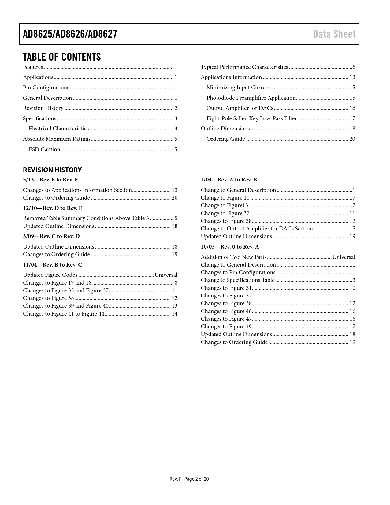 Páginas / Página20 / 2 — AD8625/AD8626/AD8627. Data Sheet. TABLE OF CONTENTS. REVISION HISTORY …
