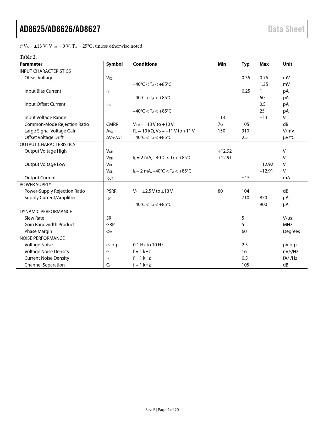 AD8625/AD8626/AD8627Data Sheet @VS = ±13 V; VCM = 0 V; TA = 25°C, unless otherwise noted. Table 2. ParameterSymbolConditionsMinTypMaxUnit INPUT CHARACTERISTICS Offset Voltage VOS 0.35 0.75 mV –40°C < TA < +85°C 1.35 mV Input Bias Current IB 0.25 1 pA –40°C < TA < +85°C 60 pA Input Offset Current IOS 0.5 pA –40°C < TA < +85°C 25 pA Input Voltage Range –13 +11 V Common-Mode Rejection Ratio CMRR VCM = –13 V to +10 V 76 105 dB Large Signal Voltage Gain AVO RL = 10 kΩ, VO = –11 V to +11 V 150 310 V/mV Offset Voltage Drift ∆VOS/∆T –40°C < TA < +85°C 2.5 µV/°C OUTPUT CHARACTERISTICS Output Voltage High VOH +12.92 V VOH IL = 2 mA, –40°C < TA < +85°C +12.91 V Output Voltage Low VOL –12.92 V VOL IL = 2 mA, –40°C < TA < +85°C –12.91 V Output Current IOUT ±15 mA POWER SUPPLY Power-Supply Rejection Ratio PSRR VS = ±2.5 V to ±13 V 80 104 dB Supply Current/Amplifier ISY 710 850 µA –40°C < TA < +85°C 900 µA DYNAMIC PERFORMANCE Slew Rate SR 5 V/µs Gain Bandwidth Product GBP 5 MHz Phase Margin ØM 60 Degrees NOISE PERFORMANCE Voltage Noise en p-p 0.1 Hz to 10 Hz 2.5 µV p-p Voltage Noise Density en f = 1 kHz 16 nV/√Hz Current Noise Density in f = 1 kHz 0.5 fA/√Hz Channel Separation Cs f = 1 kHz 105 dB Rev. F | Page 4 of 20 Document Outline Features Applications Pin Configurations General Description Revision History Specifications Electrical Characteristics Absolute Maximum Ratings ESD Caution Typical Performance Characteristics Applications Information Minimizing Input Current Photodiode Preamplifier Application Output Amplifier for DACs Eight-Pole Sallen Key Low-Pass Filter Outline Dimensions Ordering Guide