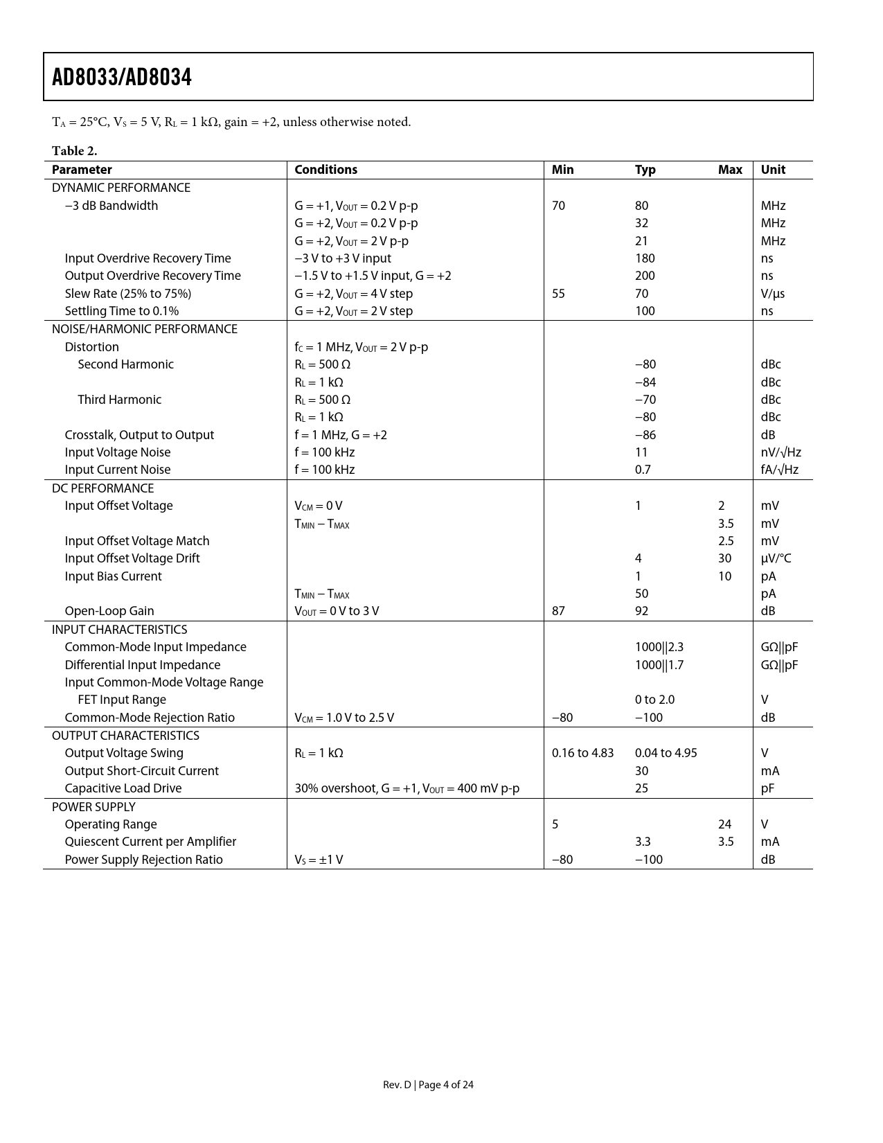 Páginas / Página24 / 4 — AD8033/AD8034. Table 2. Parameter. Conditions. Min. Typ. Max. Unit